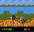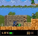 Les niveaux ? Un véritable tour du monde : désert, canyon, ville en ruine, égouts crades, forêt touffue, camp de prisonniers, train lancé à pleine vitesse… et j’en passe. C’est varié, c’est beau, et surtout ça respire le détail. Les sprites sont énormes pour une portable, et fourmillent d’animations rigolotes : le héros qui boit à sa gourde ou balance un petit coucou si vous glandez trop longtemps, c’est le genre de détail qui fait tout.