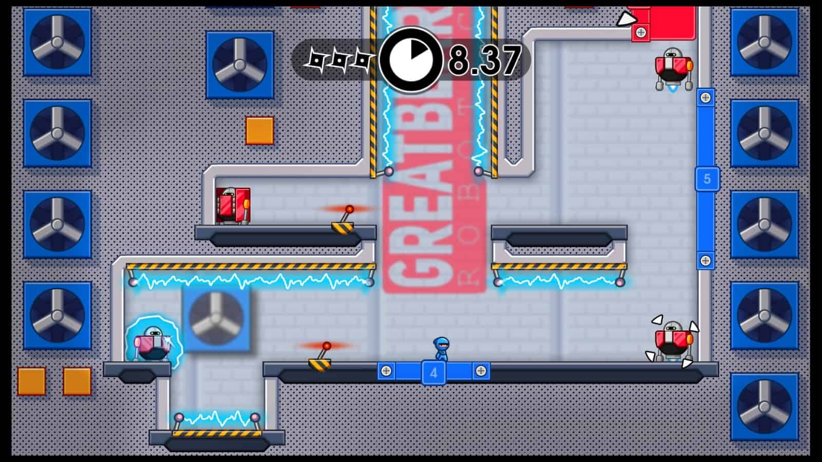 Côté gameplay, on est donc typiquement dans le Die & Retry. Le ninja est nerveux et très réactif. Au début de chaque niveau, il dispose d’un double saut, d’un katana et de 3 shurikens maximum. Lancer ces derniers dans le bon ordre et sur les bonnes cibles sera primordial. D’autres mécanismes viennent régulièrement agrémenter le level-design, tels que des barrières électrifiées, des portes à interrupteurs ou encore des murs réflecteurs.