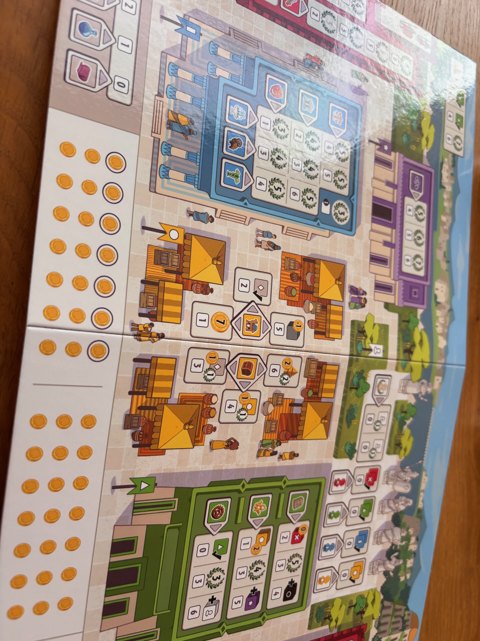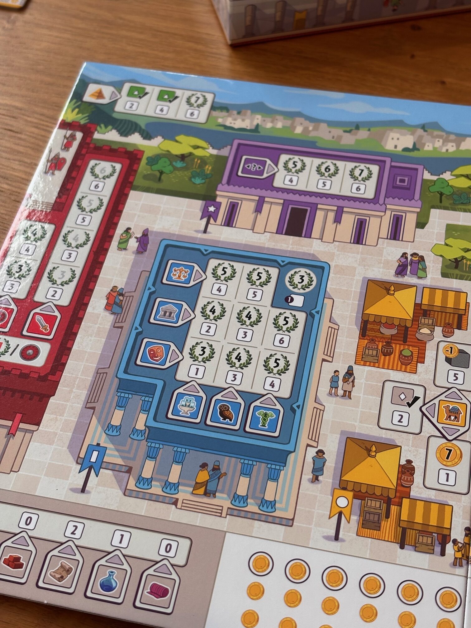 La partie s’arrête dès qu’un joueur a terminé ses trois bâtiments. Mais tout le monde marque : les bâtiments incomplets rapportent eux aussi des points, parfois presque autant que les terminés. Chaque avancée compte ; on progresse, on gratte des points ici ou là, et la tension reste palpable jusqu’à la dernière case. Et puis il existe un petit twist : un seul bâtiment dans le jeu octroie un bonus de points au premier joueur qui le complète. Autant dire que la course est parfois féroce pour ce prestige particulier !