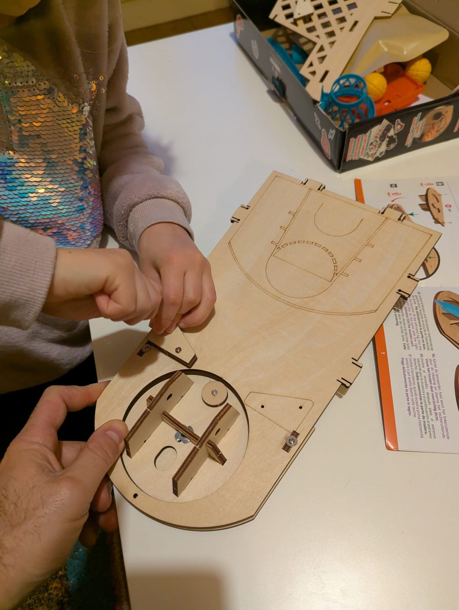 Le montage du jeu est une activité en soi. L’enfant assemble plusieurs pièces en bois prédécoupé, un peu comme un kit Lego mais avec une sensation plus “réelle”. On visse, on enclenche, on positionne et on ajuste.