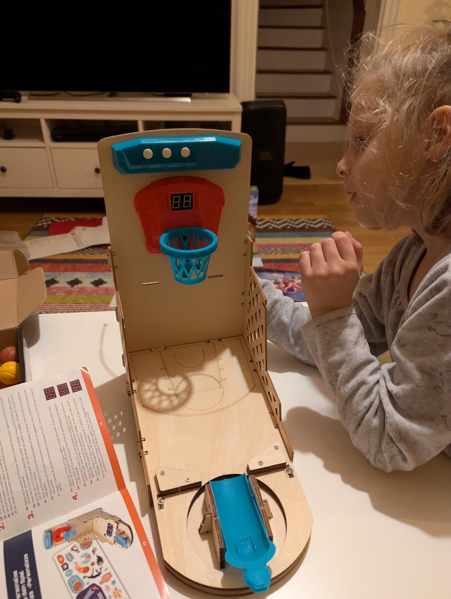 Ce jouet nous a plu autant pour son côté DIY/Bricolage que pour son aspect jeu d’adresse. Avant de jouer, l’enfant doit travailler ! Il assemble, visse, teste et comprend comment fonctionne lepetit module électronique. Une fois la structure montée, place au challenge ! Le compteur LED s’allume, les lancers commencent et l’envie d’améliorer son score arrive très vite.