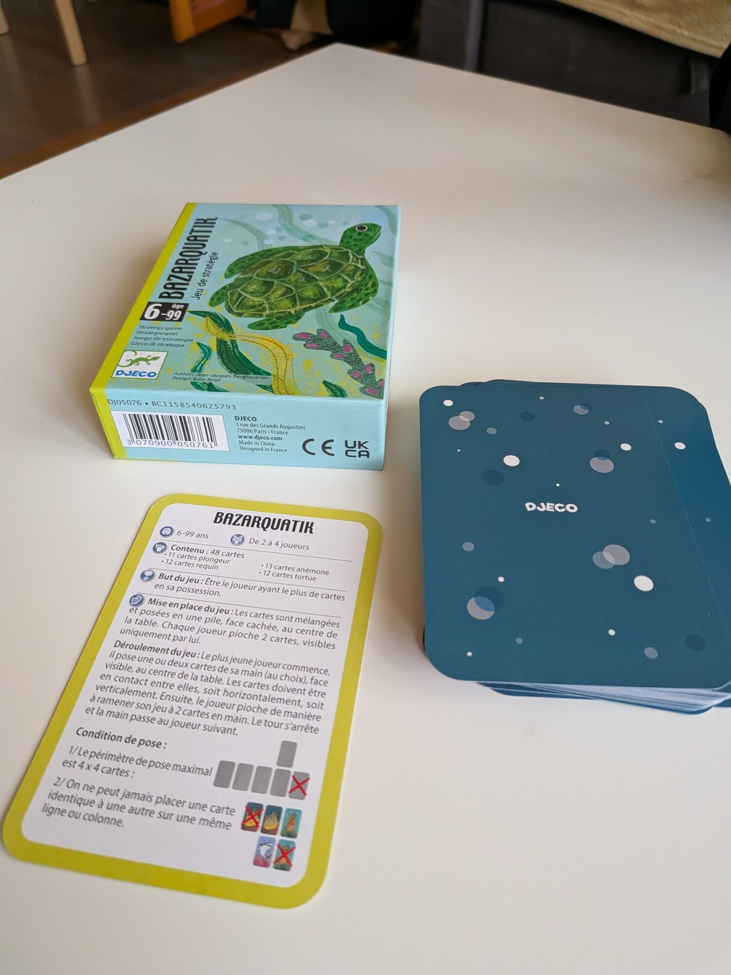 Bazarquatik est un jeu de sociĂ©tĂ© rapide et accessible qui plonge les joueurs dans un univers marin colorĂ©. Ici, les animaux aquatiques sâaffrontent selon une logique simple mais piĂ©geuse. Le jeu sâadresse principalement aux enfants Ă partir de 6 ans, mais il fonctionne aussi bien avec des adultes.