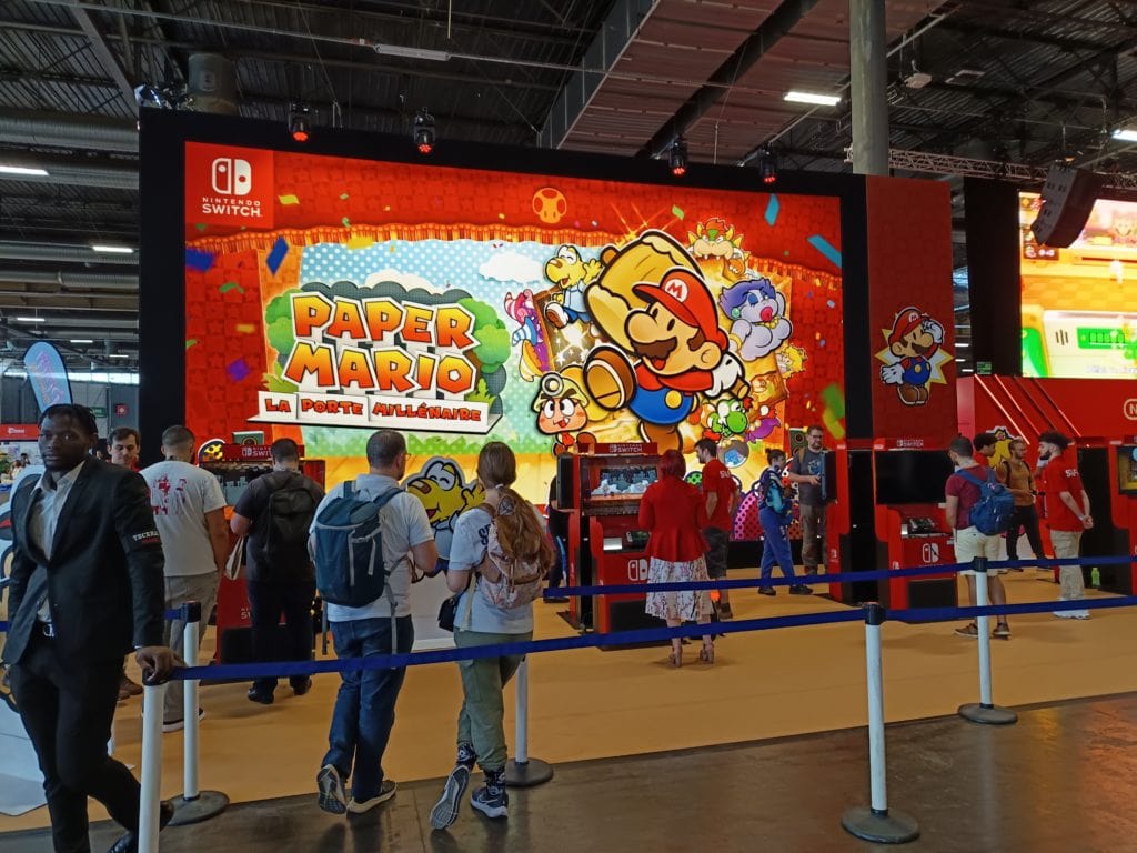 Au loin, je vois enfin Nintendo (en vrai, impossible de le louper tellement leur stand est immense) ! Je découvre leurs derniÚres et prochaines sorties. Ayant déjà joué à « Mario Bros Wonders », « Princess Peach Showtime », « Mario Kart 8 », je me laisse aller à découvrir « Paper Mario ».