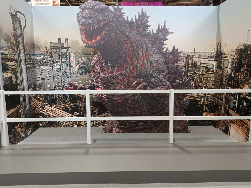 Sans tarder, j’en profite pour visiter les diffĂ©rentes expositions proposĂ©es. Celle sur les 70 ans de Godzilla. Etant fan de ces univers de Kaijus, j’ai pris le temps de profiter de cette rĂ©trospective qui retrace l’histoire de ce monstre mythique ainsi que celle de ses alliĂ©s, de ses ennemis au travers des multiples films trĂšs souvent Ă©ponymes.