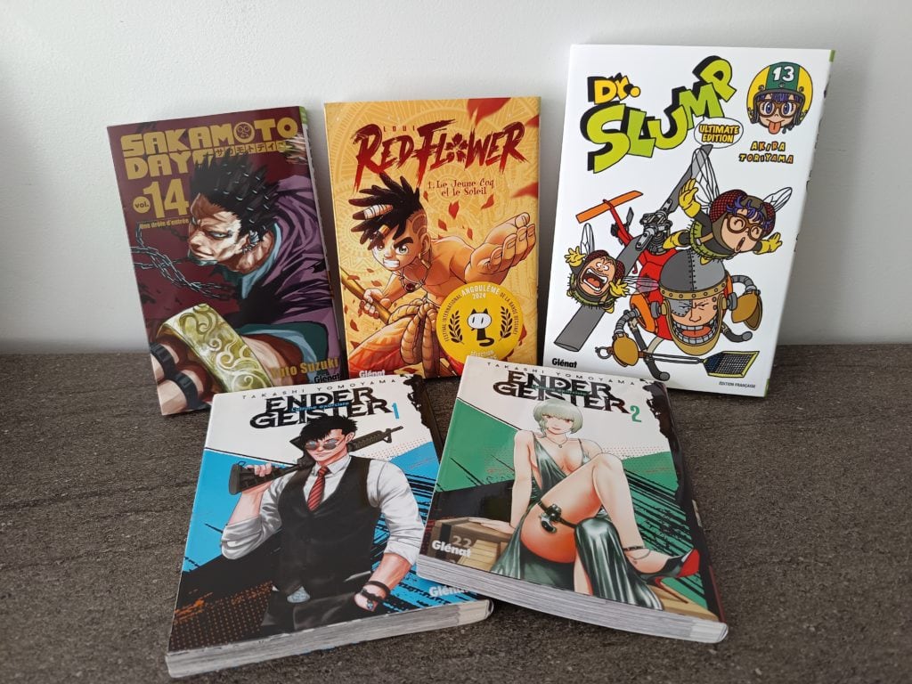 En conclusion, je finis chez GlĂ©nat! Je sais que mon porte monnaie sera beaucoup plus lĂ©ger en repartant. Je m’empare du « Sakamoto Days » vol.14 par Yuto SUZUKI, des volumes 1 et 2 de « Ender Geister » par Takashi YOMOYAMA, du « Dr Slump » ultimate Ă©dition vol.13 par Akira TORIYAMA et enfin du manga « Red Flower » par Loui (mangaka français).