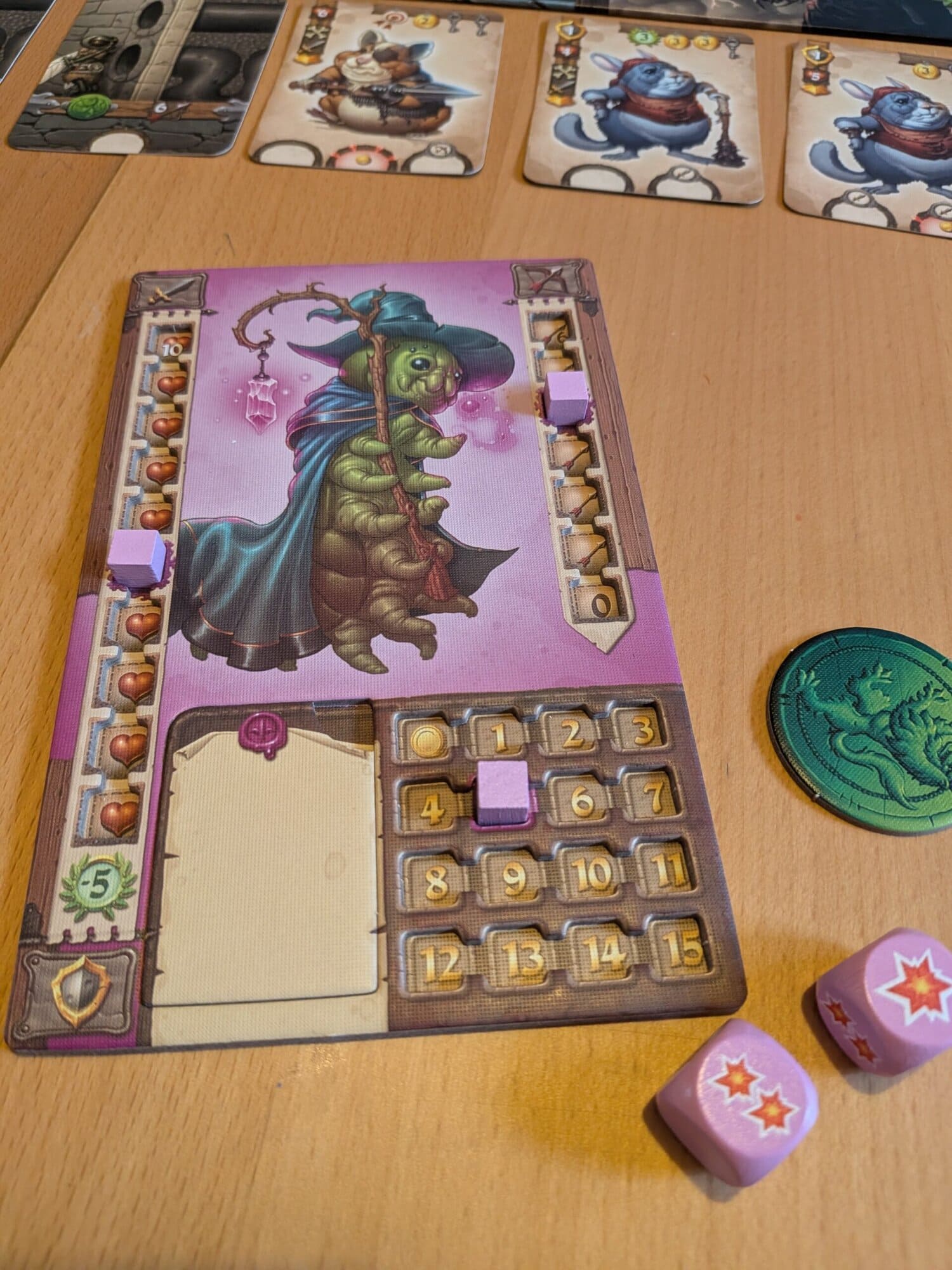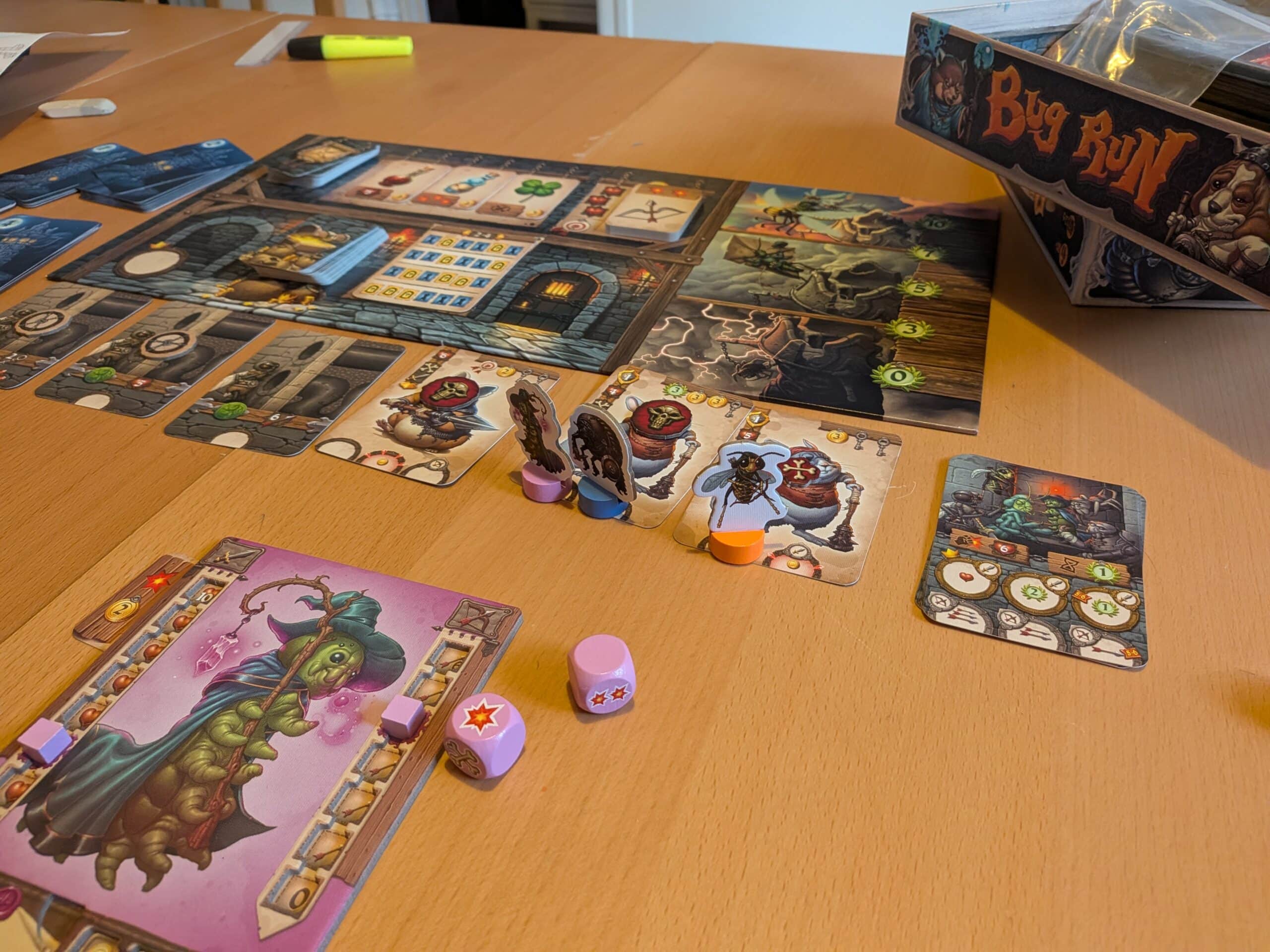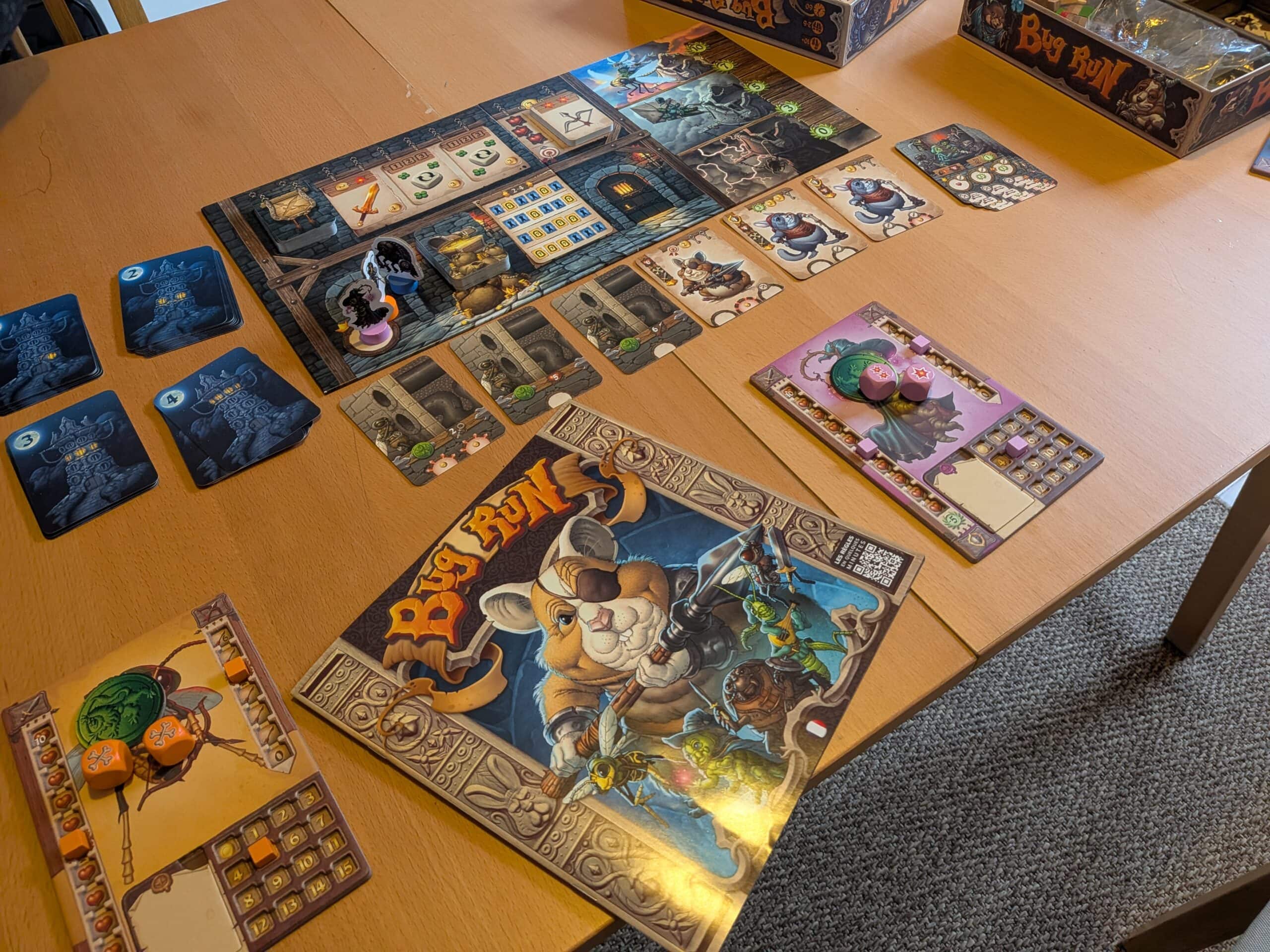 Le thème est immédiatement accrocheur. Les joueurs incarnent des insectes aventuriers lancés dans une grande course semée d’embûches. L’ambiance est légère, colorée et cartoon. On se rapproche presque d’un jeu vidéo de type RPG simplifié. On y trouve de l’équipement, des potions, des améliorations et des choix tactiques permanents. Cependant, tout reste lisible et fluide. Bug Run ne cherche jamais à être un jeu expert.
