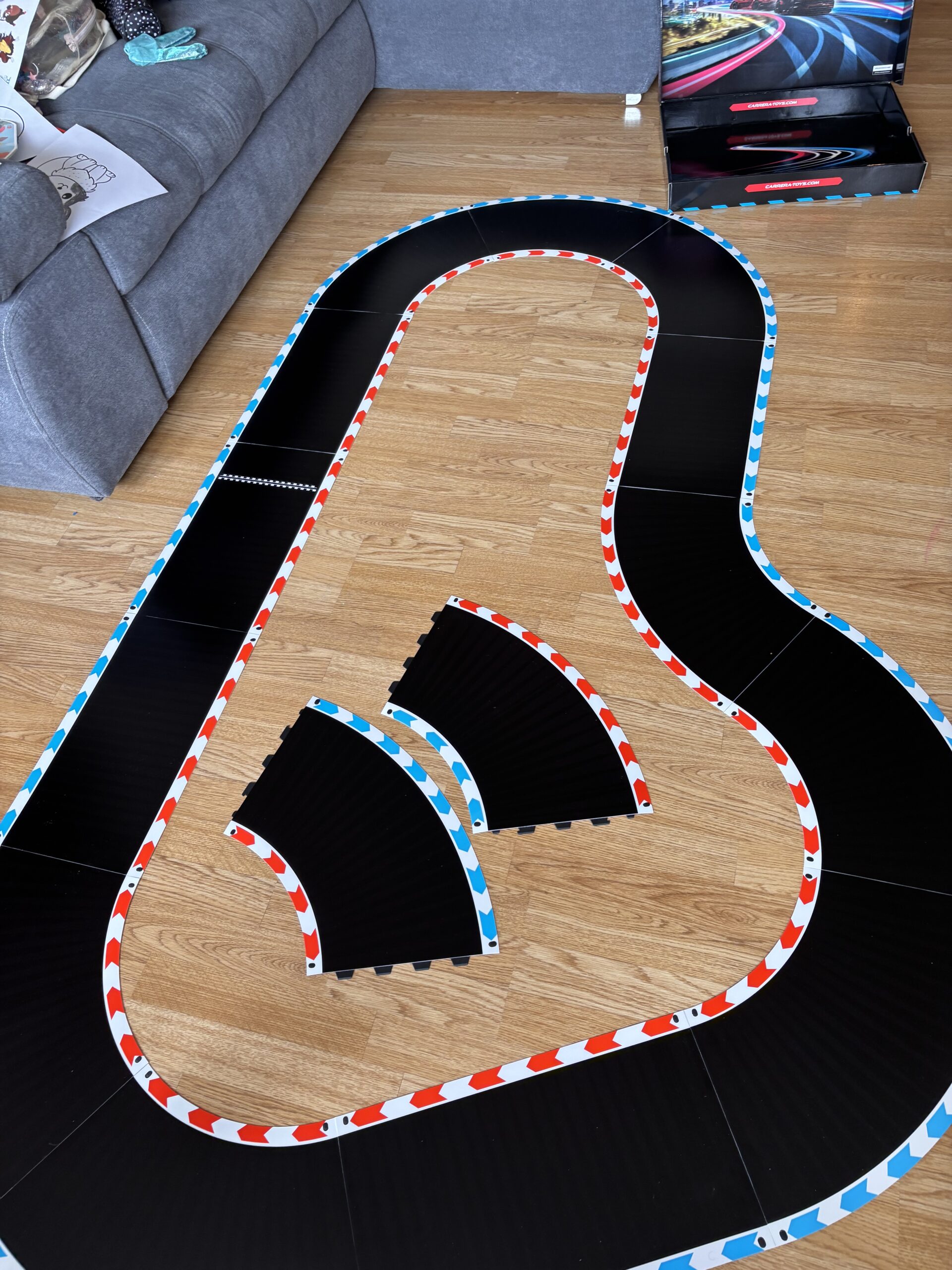 Côté fabrication, Carrera Hybrid oscille entre modernité et fragilité. Les plaques vinyliques, fines et souples, ont un avantage évident : elles se posent directement au sol sans vous gêner. On peut littéralement marcher dessus sans risquer de les plier ni de faire basculer une voiture. C’est malin et pratique pour un usage en intérieur, surtout si le circuit reste installé plusieurs jours, car il s’intègre presque naturellement à la pièce.