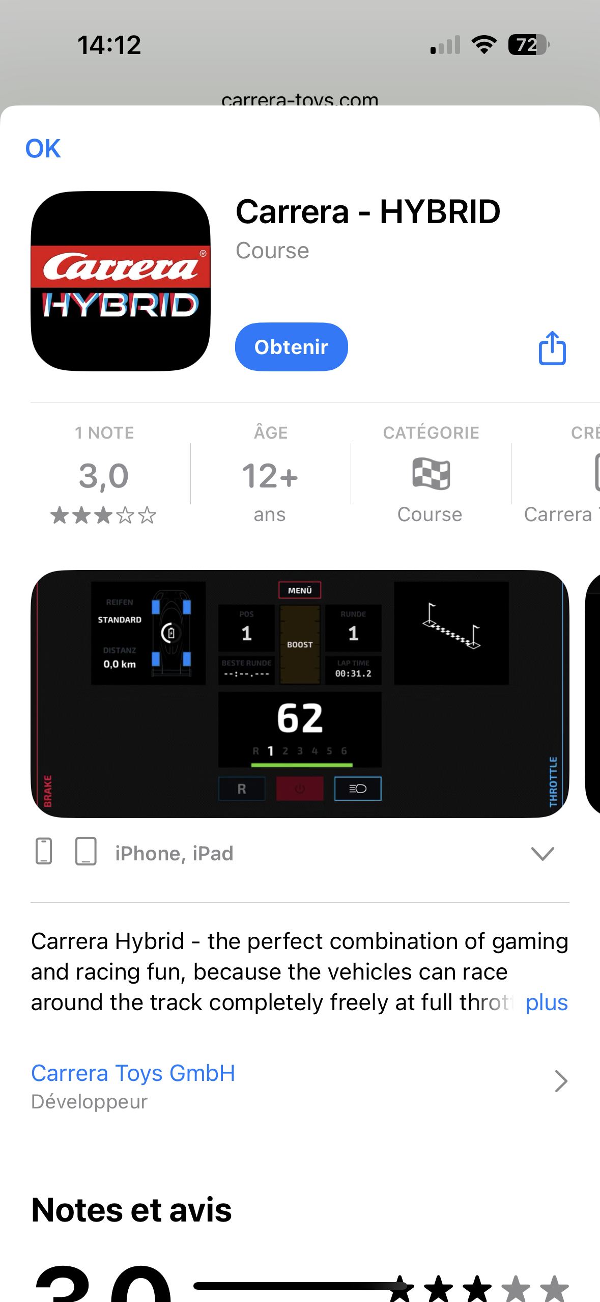À l’intérieur de la boîte, pas de grosse notice papier. À la place, un QR code vous envoie directement vers l’application Carrera Hybrid, disponible sur Android et iOS. C’est elle qui devient le véritable cœur du jeu.