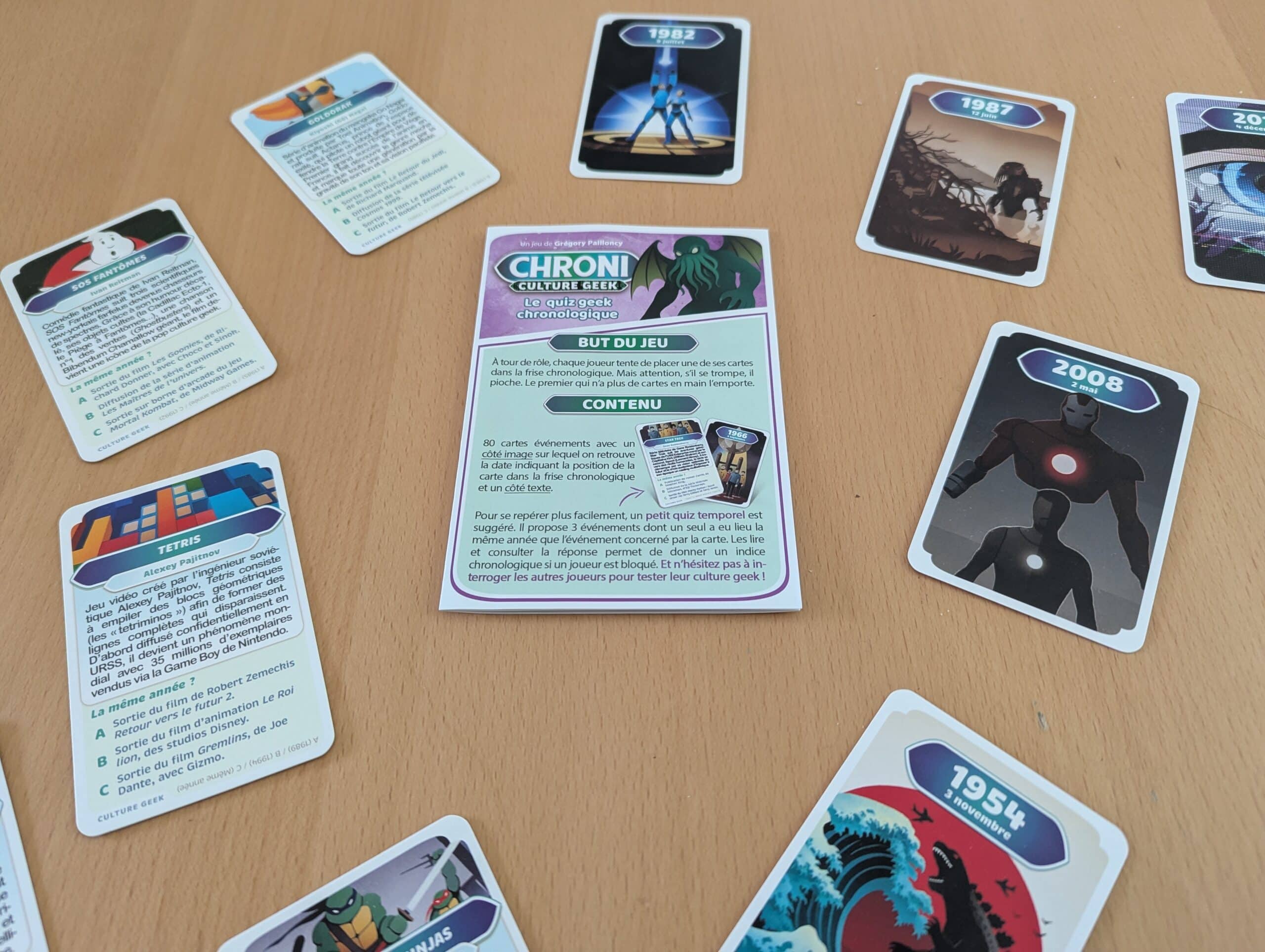 La boîte propose 80 cartes, de quoi jouer plusieurs parties sans lassitude (vous n’utiliserez qu’une quinzaine/vingtaine de cartes par session). Et le vrai plus : toutes les boîtes Chroni se combinent. Vous pouvez mixer Geek, Pop, Histoire de l’art ou Inventions pour des parties plus variées et corsées.