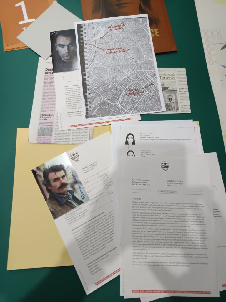 Pour commencer, il faut ouvrir le feuillet inscrit « Tour 1 » où l’on y trouve un petit texte et ensuite, le jeu nous propulse directement dans l’enquête. Nous y trouvons des informations concernant le meurtre d’une jeune fille dans les années 90 à Roubaix. Témoignages, rapports d’autopsie, articles de presse du jour, plan de la ville.