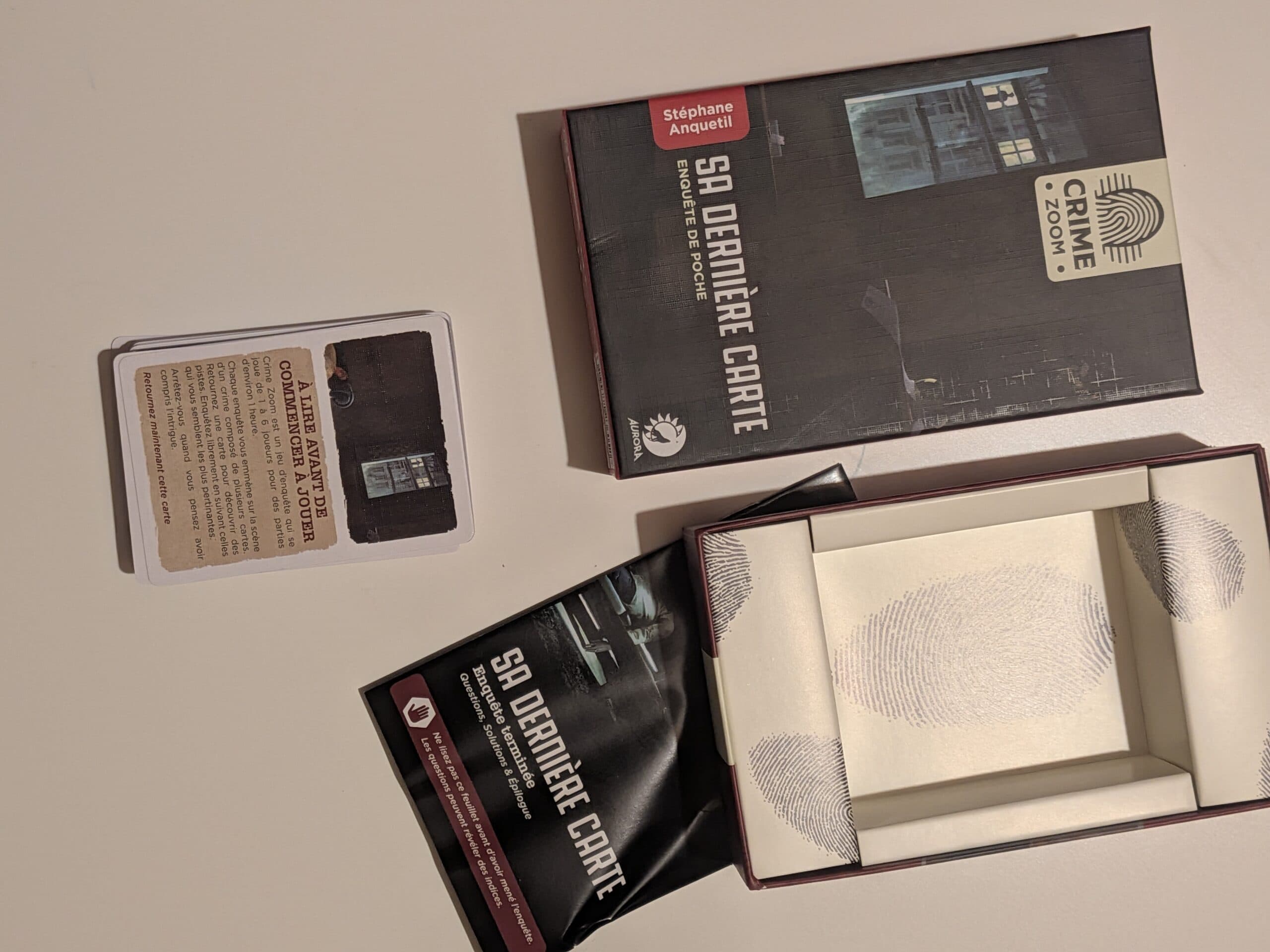 Aurora Games est une petite maison d’édition française de jeux de société apparue dans le paysage ludique au début des années 2020. L’éditeur s’est notamment fait remarquer lors du Festival International des Jeux de Cannes 2021, où la gamme Crime Zoom a été présentée au public. La série Crime Zoom constitue le cœur du catalogue d’Aurora Games. J’ai testé aujourd’hui Sa dernière carte, mais il y a d’autres scénarios comme Mauvais œil, Fenêtre sur crimes ou Un écrivain mortel.