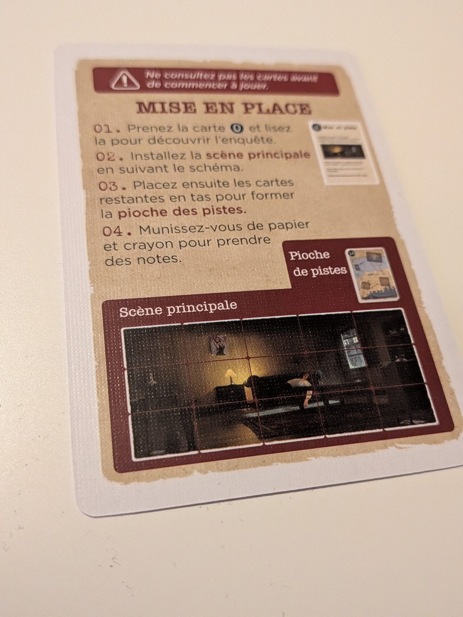 Avant de commencer, il faut lire les premières cartes du deck. Elles fournissent une explication courte et claire sur le principe général du jeu. Elles indiquent également comment manipuler les cartes sans se spoiler ! Ainsi, la prise en main est très intuitive. Quelques minutes suffisent pour comprendre le fonctionnement. De plus, le matériel est agréable. Les cartes sont épaisses et bien imprimées. Elles donnent envie d’être manipulées. Cet aspect tactile renforce l’immersion dans l’enquête.
