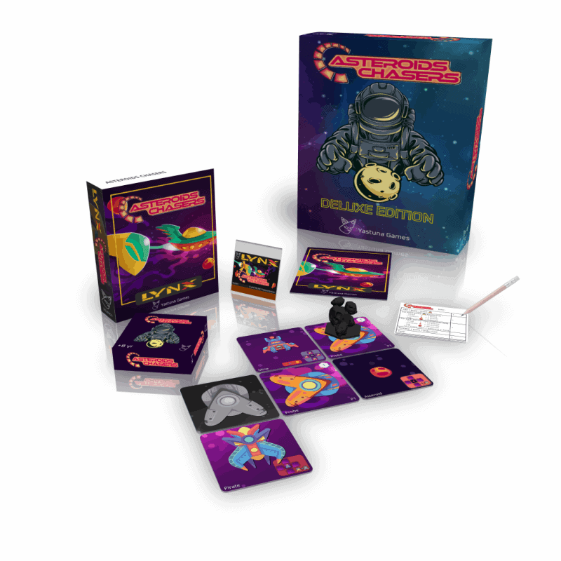 Véhicule spatial et cartes du jeu de société Asteroids Chasers Deluxe Edition, jeu de stratégie et aventure pour amateurs de jeux de société et de science-fiction.