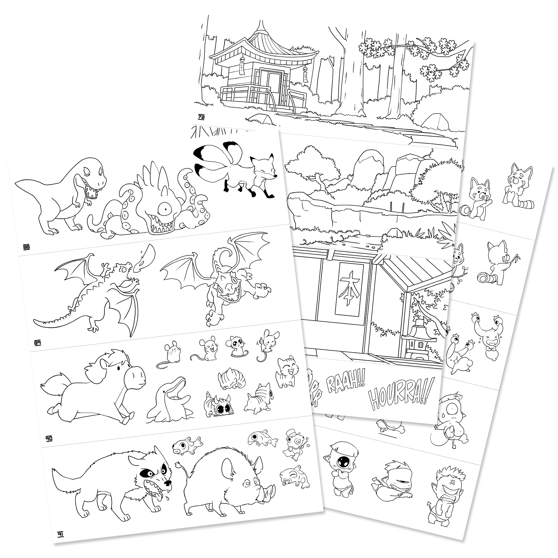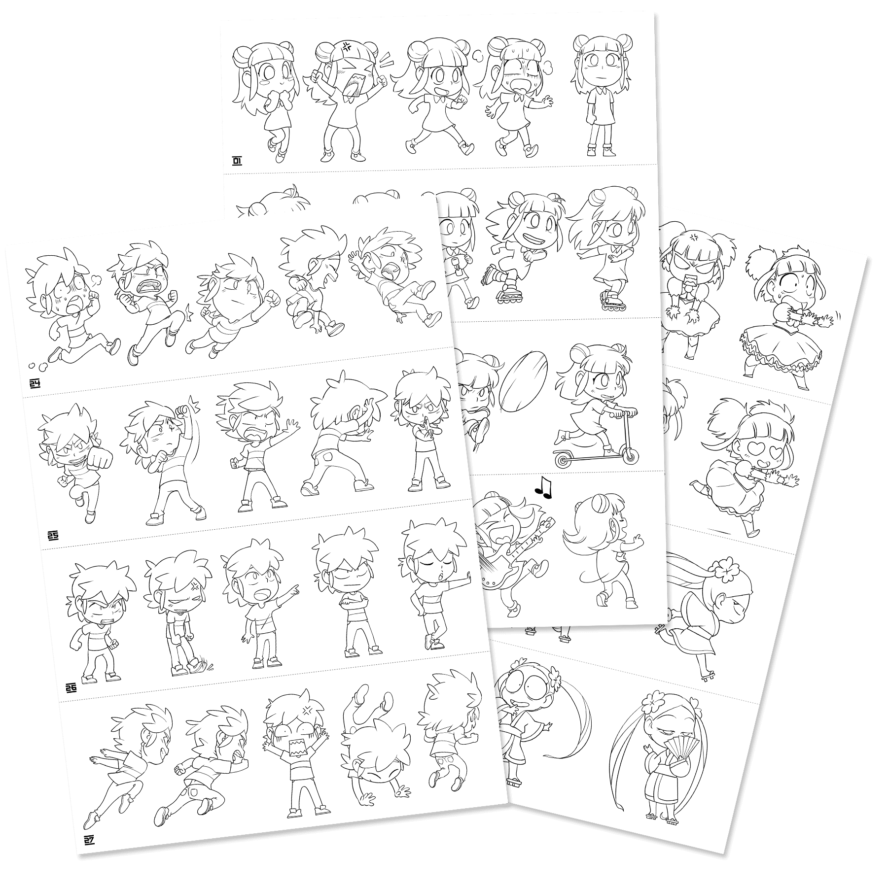 - Des planches modèles avec plus de 300 dessins (personnages, décors, objets…) permettant de s’inspirer ou de décalquer.