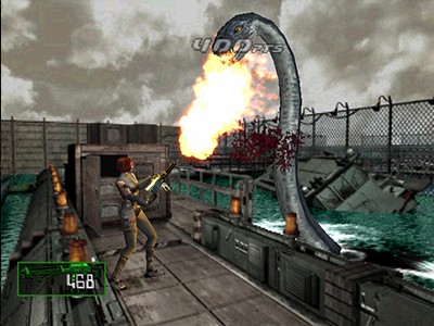 Ici, Capcom lâche carrément la bride avec des vélociraptors rapides, des tyrannosaures énormes affichés en masse sans ralentissement. Même sur des zones aquatiques, on a des effets impressionnants et des dinosaures typiques de chaque milieu. Par ailleurs, on sent un énorme effort sur l’animation et l’IA, car les dinos vous traquent vraiment, vous encerclent, vous attrapent et vous mâchouillent avec amour. Enfin, comme souvent chez Capcom à l’époque, le son joue un rôle clé, puisqu’on entend les cris au loin avant l’attaque, ce qui renforce cet action-horror rapide. On reste toujours sur une VOST FR efficace, sublimé par de très belles cinématiques et une vraie identité artistique dans l’ensemble. Avec ce second volet, on peut VRAIMENT parler d’un jeu avec des dinosaures !