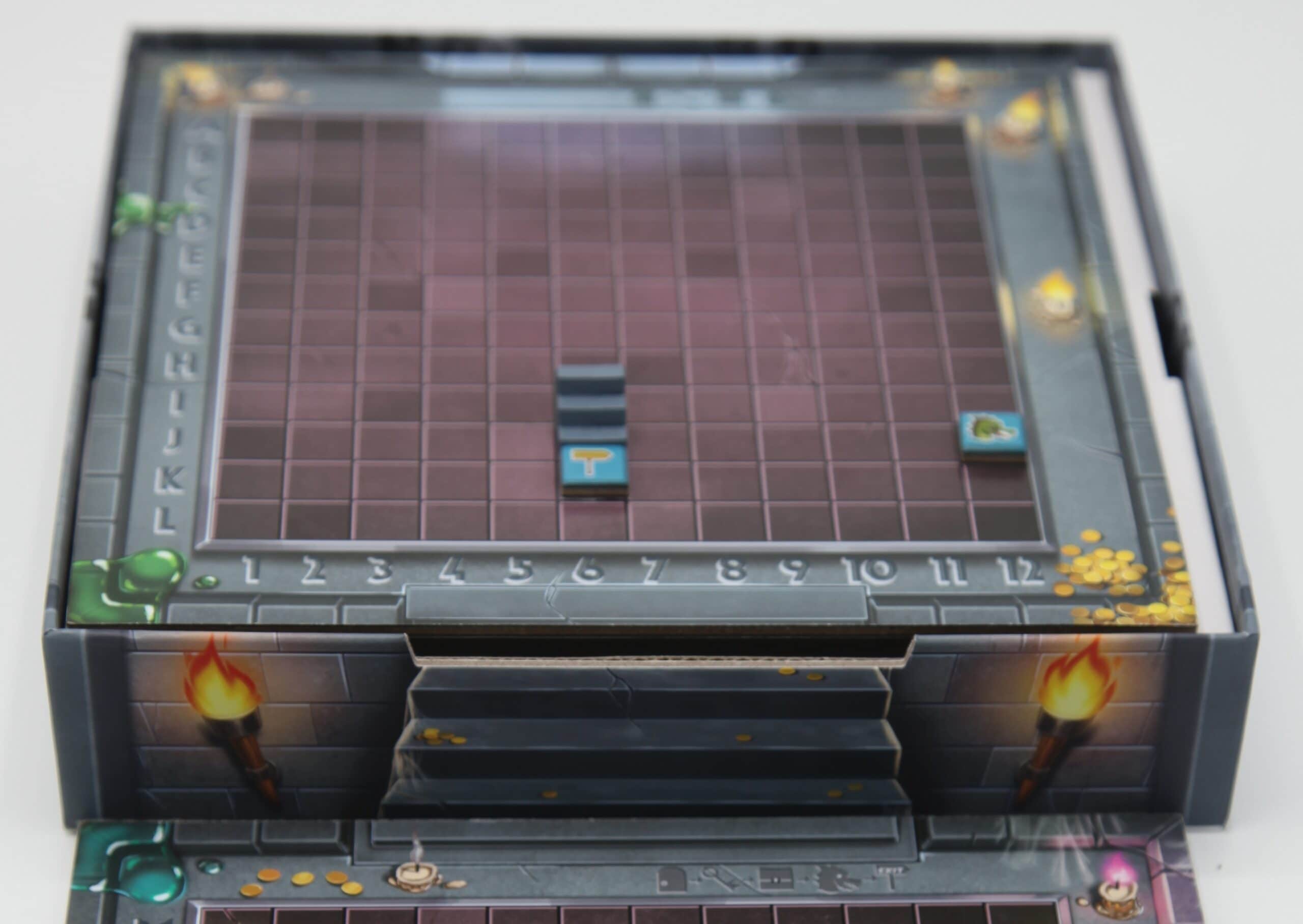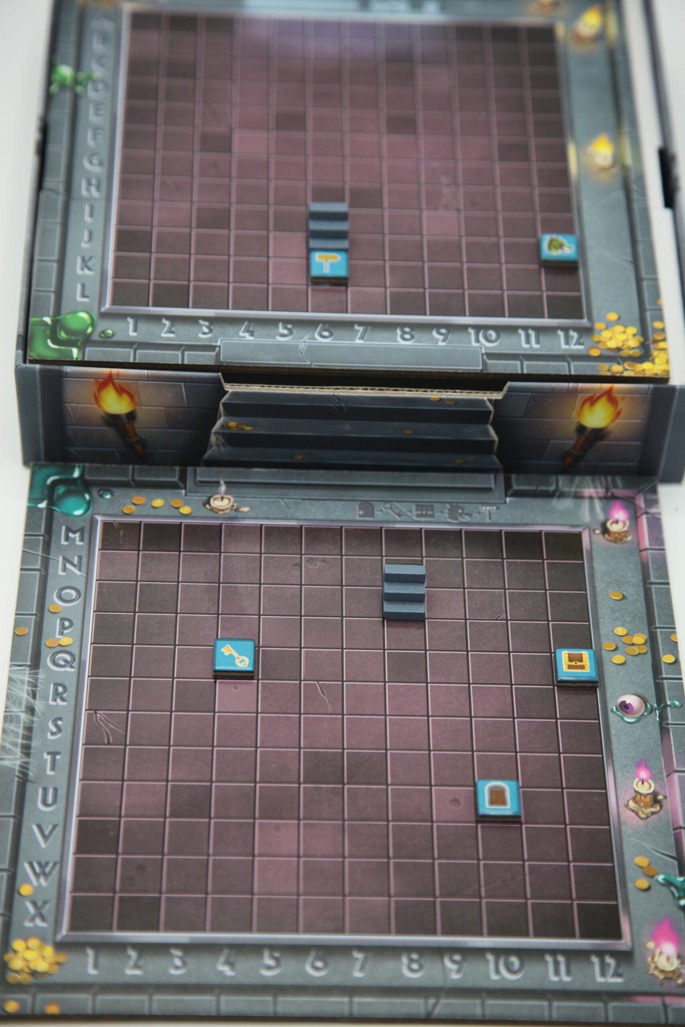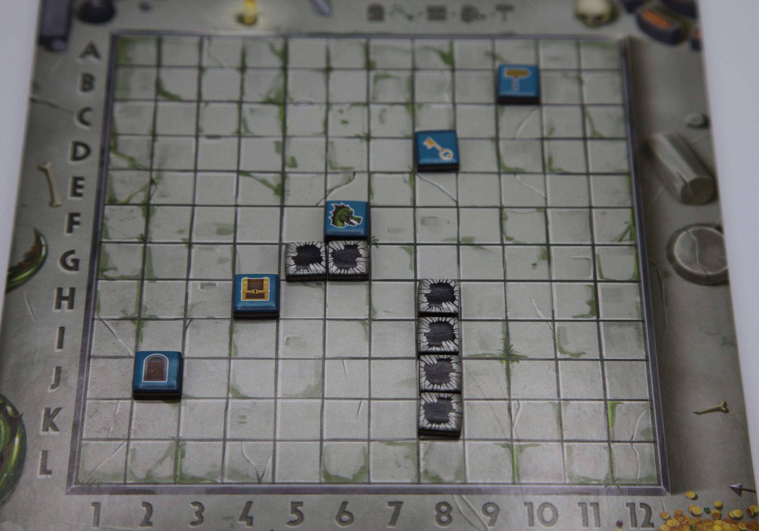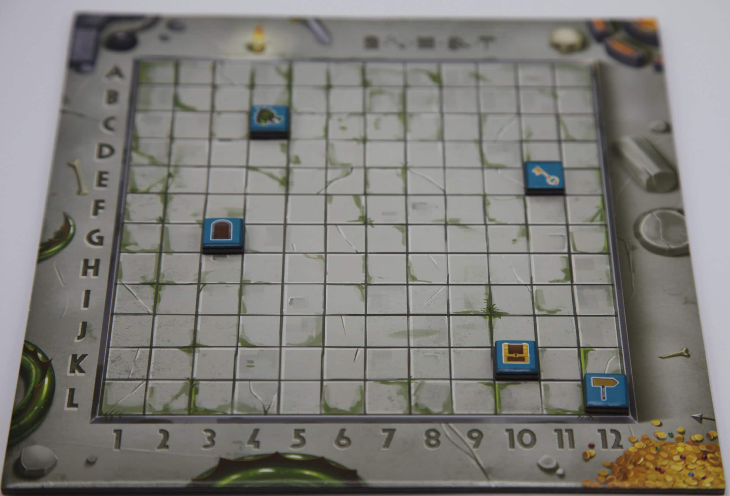 La mécanique est simple : dans Dungeon Exit, vous incarnez un aventurier explorant un donjon représenté par un damier avec coordonnées. Comme dans un jeu de rôle papier façon « porte-monstre-trésor », chaque partie demande de placer différents éléments : la porte, la clé, le coffre, le monstre et enfin la sortie.