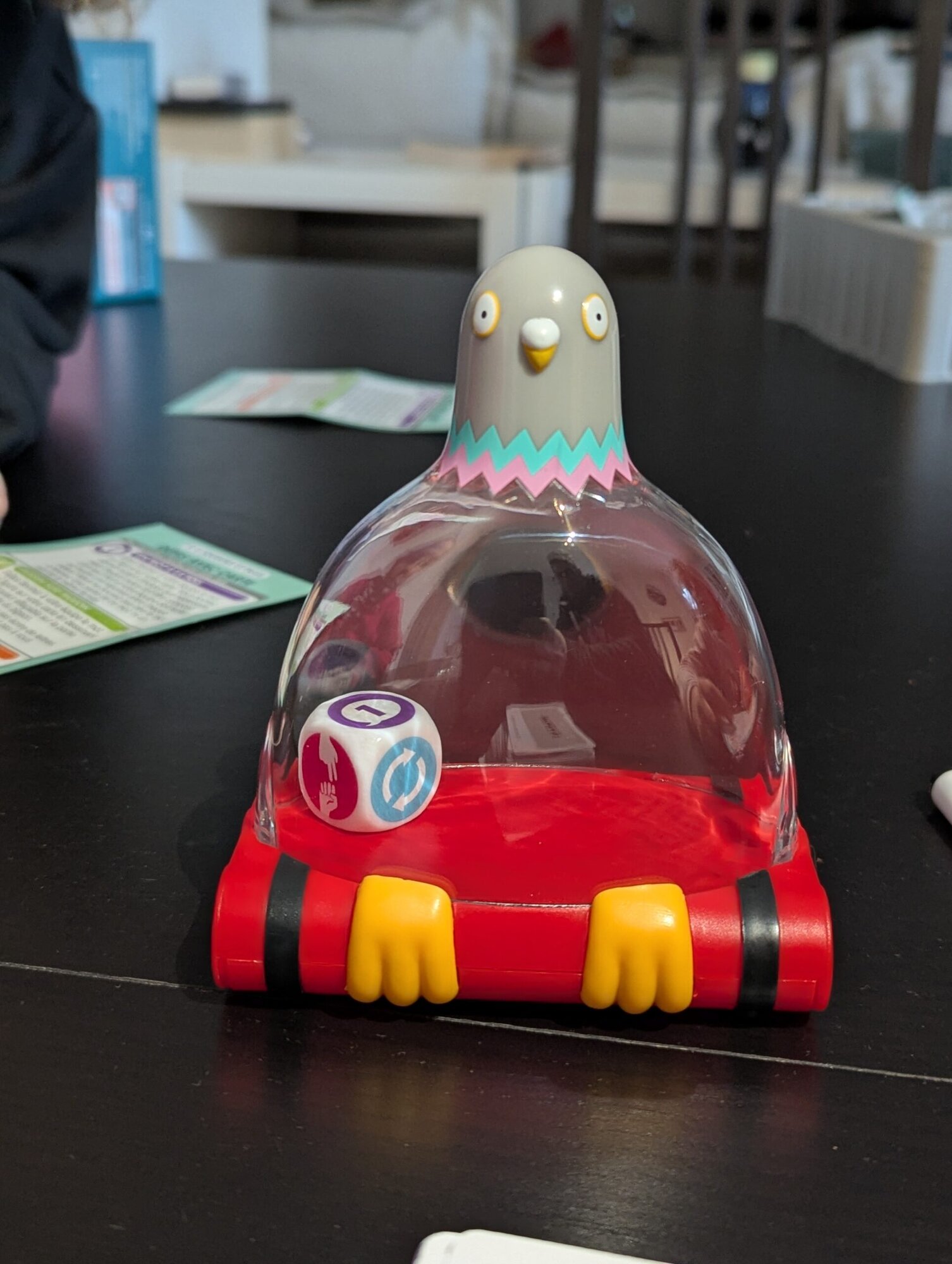 Les joueurs se répartissent en deux équipes (une variante pour 3 joueurs est dispo) et se positionnent afin de pouvoir se passer le pigeon-timer. Si les équipes ne sont pas de taille égale, cela n’a pas d’importance. On place le pigeon-timer (le secoueur) au centre, et on décide quelle équipe commence. Vous pouvez jouer ça à pierre-feuille-ciseaux pour vous échauffer si vous voulez 😉