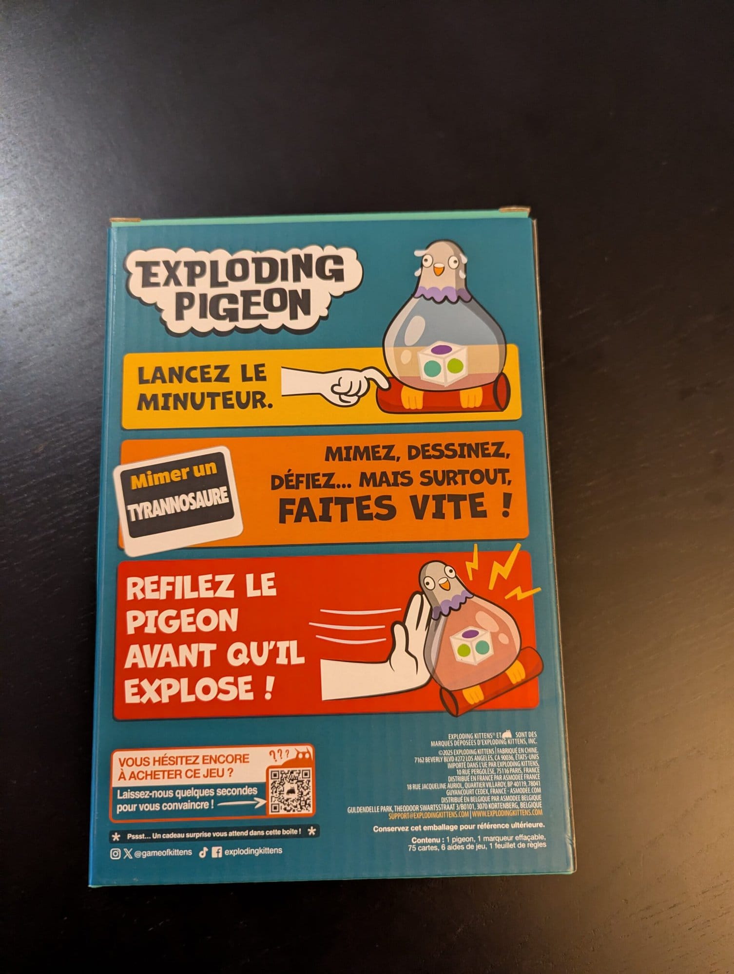 Le jeu Exploding Pigeon est un jeu d’ambiance familial dans lequel le fun est mis à l’honneur. Plusieurs équipes vont enchaîner des défis sous la pression d’un… pigeon explosif. Le thème est absurde, léger, complètement déjanté : on secoue un pigeon « timer », on révèle un défi (dessiner, mimer, donner un mot-indice, jouer à pierre-feuille-ciseaux), on réussit le plus vite possible, et on passe le pigeon à l’équipe adverse avant qu’il n’explose ! Excitation ga-ran-tie !
