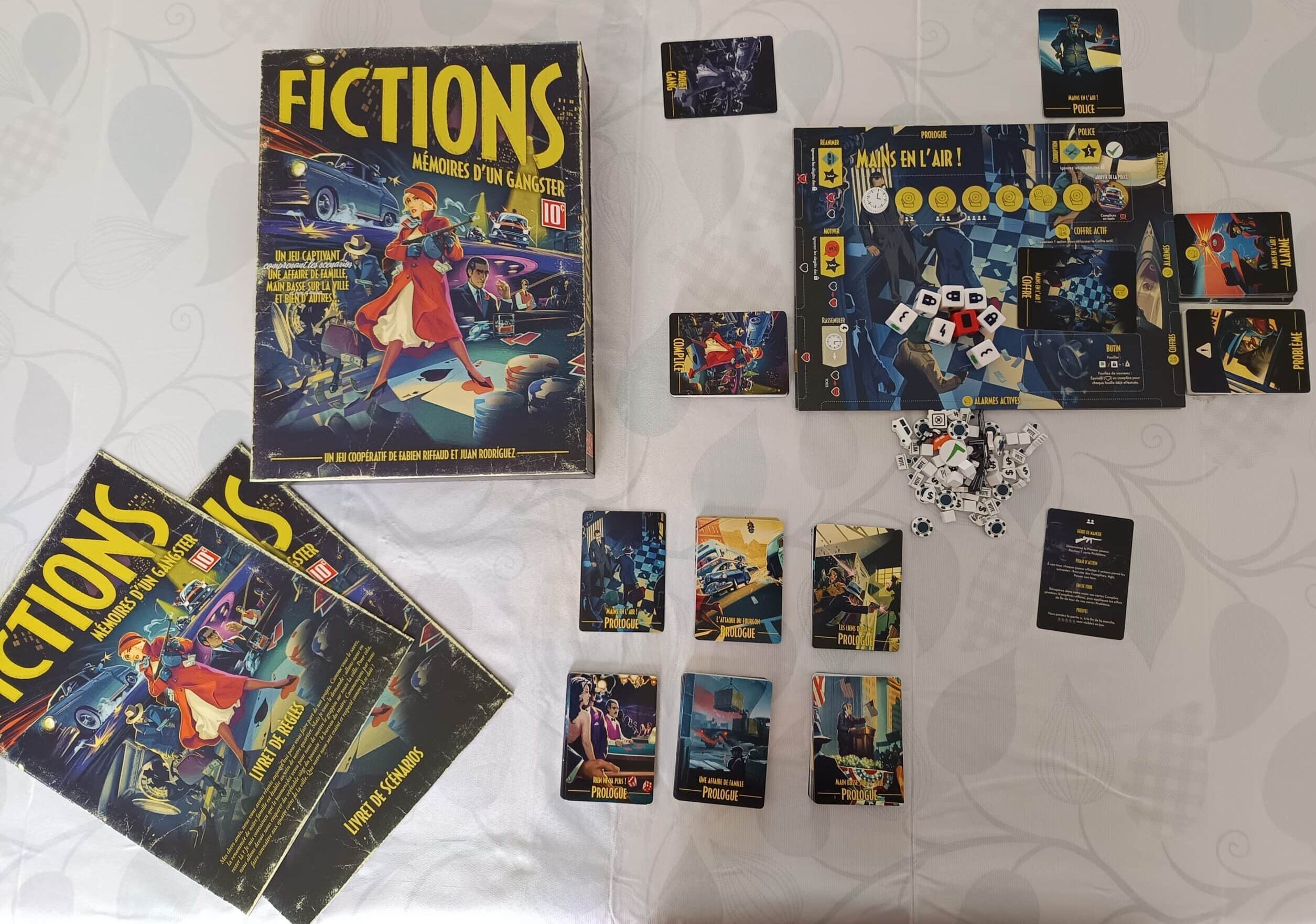 Jeu crée par Fabien RIFFAUD (Les Poilus) et Juan RODRIGUEZ (Les Poilus, Cartzzle ou encore Tracks) il est édité chez Ludonova et distribué par Asmodee, « Fictions, les Mémoires d’un Gangster » est un jeu coopératif où 1 à 4 joueurs incarnent les chefs d’un gang mafieux dont l’objectif est de gagner en pouvoir pour prendre le contrôle de la ville en remportant les élections dans le scénario final. Pour ça, il doivent d’abord terminer deux scénarios afin d’obtenir assez de réputation pour que les Complices les plus craints de la ville rejoignent leurs rangs et les aident à concrétiser leurs plans pleins d’ambition.