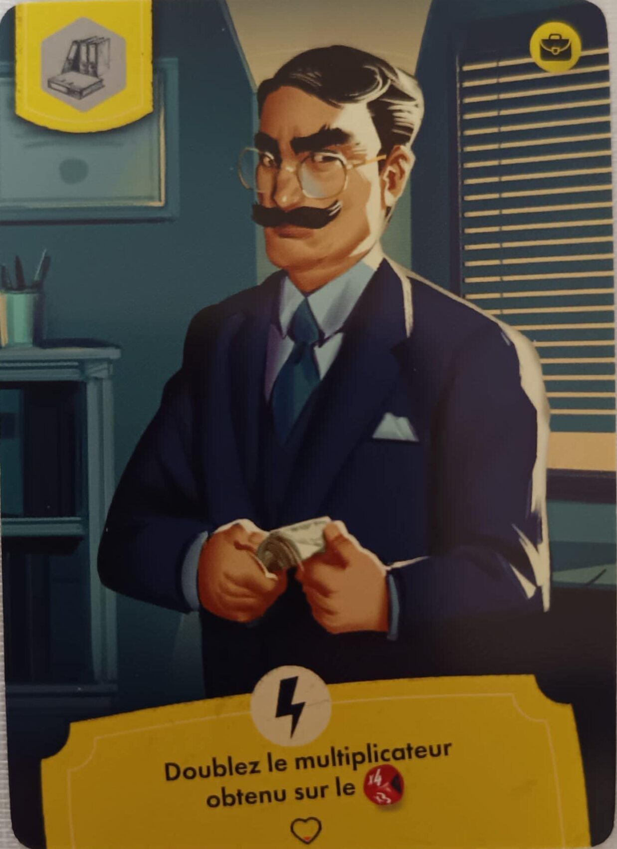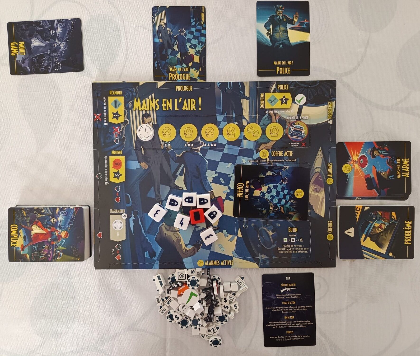 - Résolution des défis: Sur chaque carte « Complice », on trouve des icones « Talent » et/ou « Compétence ». Les « Talents » (5 au total) permettent au joueurs de jouer les bons « Complices » au bon moment, et les « Compétences » permettent de booster/faciliter l’action avant/après les lancers de dés. Pour se faire, le joueur actif doit lancer les dés afin de dépasser la difficulté annoncée par le défi. En ca de réussite, les joueurs peuvent continuer leur aventure mais en cas de défaite, des malus s’appliquent pour la suite (Alarme qui retentit, Police qui débarque plus vite, etc..).