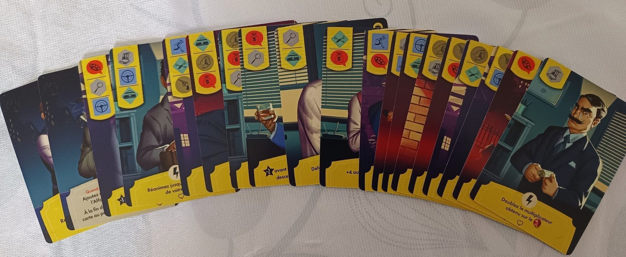 Le matériel est plutôt sympathique et les cartes sont agréables à manipuler. Les graphismes sont agréables et mettent dan sl’ambiance polar souhaitée par les auteurs. Les deux petits bémols selon moi, est le vide de la boite ainsi que le manque de rôles/noms des cartes « Complices ». Je pense qu’un tray de rangement aurait pu compenser ce vide et aurait aussi permis de ranger les cartes par scénario, là, où il n’y a que quelques pochettes plastique pour seul rangement.
