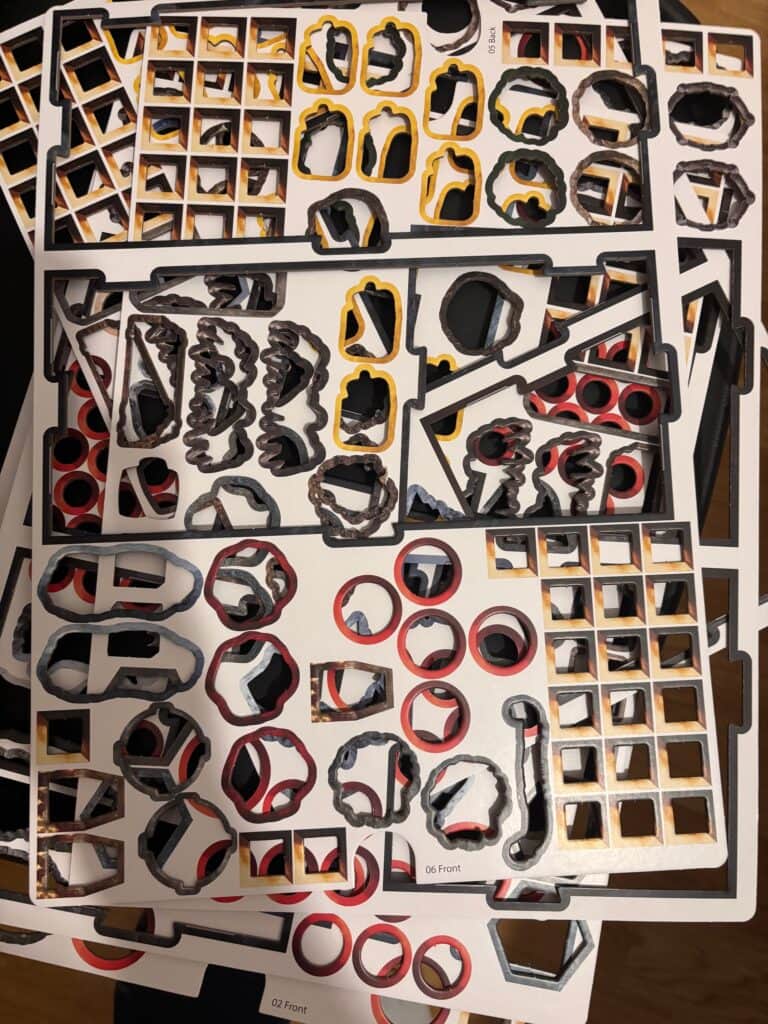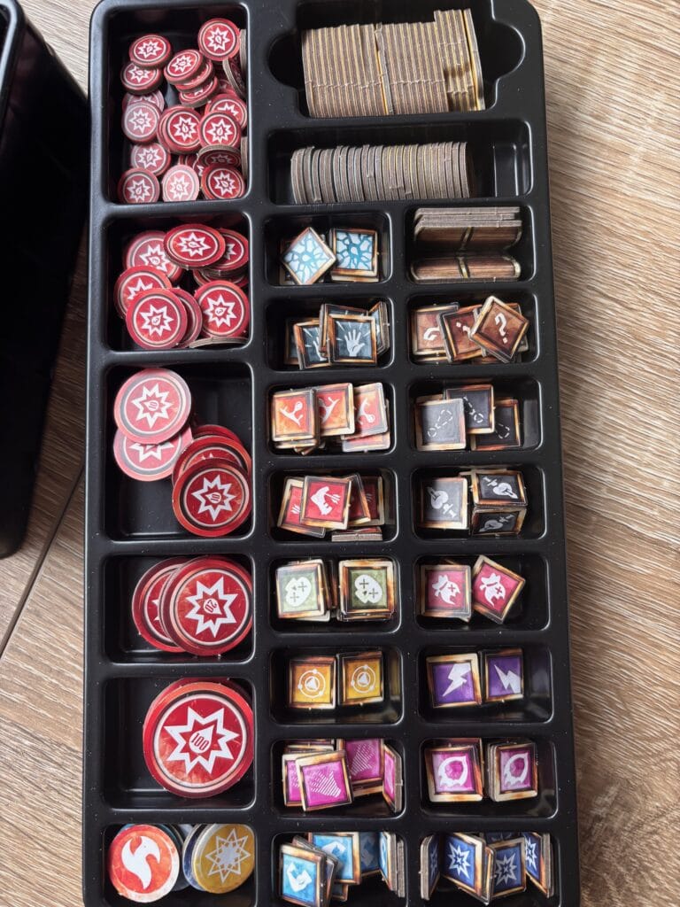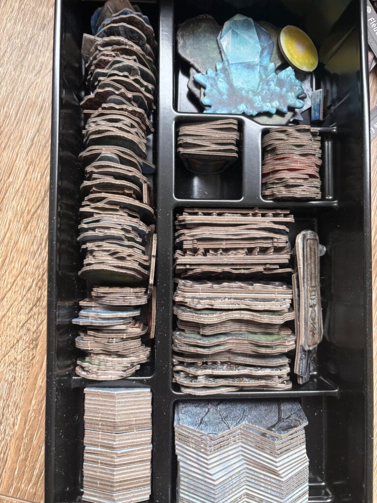 Spoiler : ça ne rentre pas. Ou plus dans la boîte. Une fois le jeu dépunché, c’est fini. Vous ne re-rangerez jamais tout ça dedans. Des rumeurs disent qu’ils ont embauché un sous-officier de sous-marin pour optimiser l’espace. Il a jeté l’éponge (blague). Même Marie Kondo aurait pleuré.