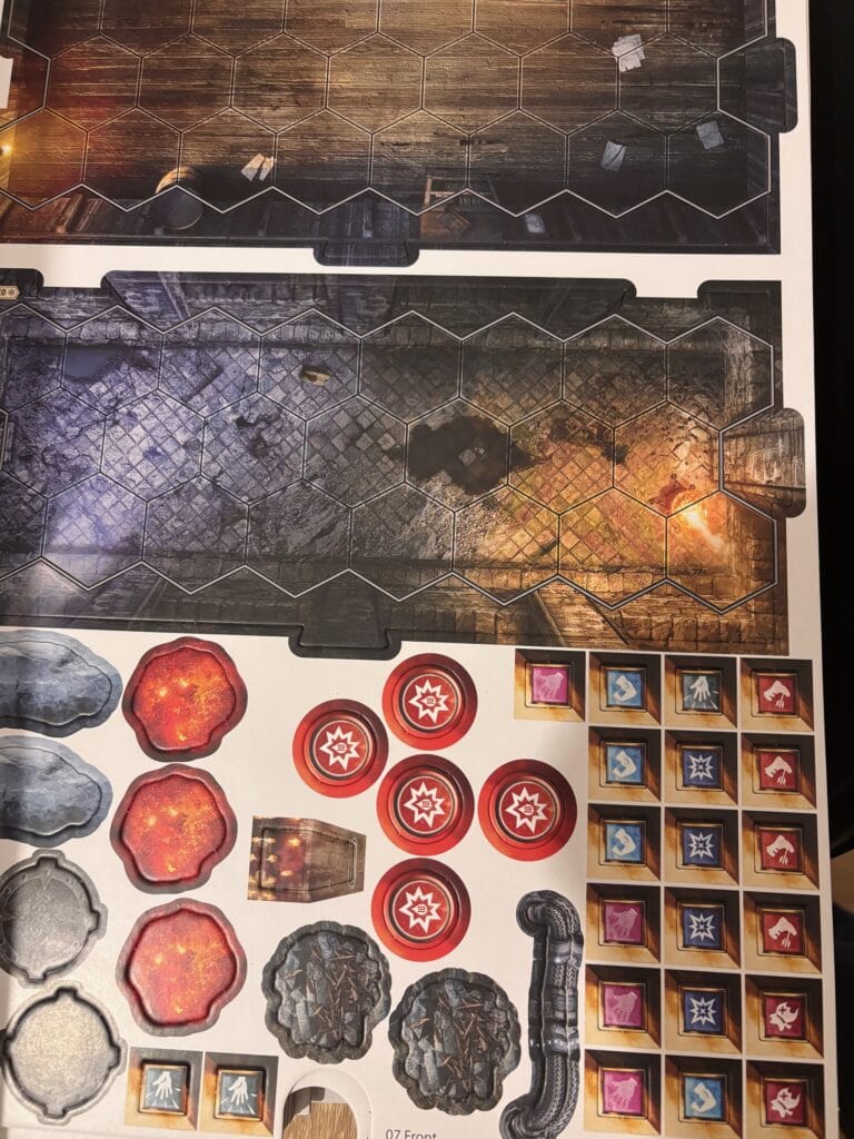 Alors qu’y a-t-il dans cette fameuse boîte ? Des cartes. Des tuiles. Des enveloppes. Des autocollants. Des figurines (les héros, hein, les monstres sont en standees comme dans Gloomhaven). Des livrets. Un classeur. Une carte du monde. Des sachets, des planches, des punchboards à n’en plus finir.