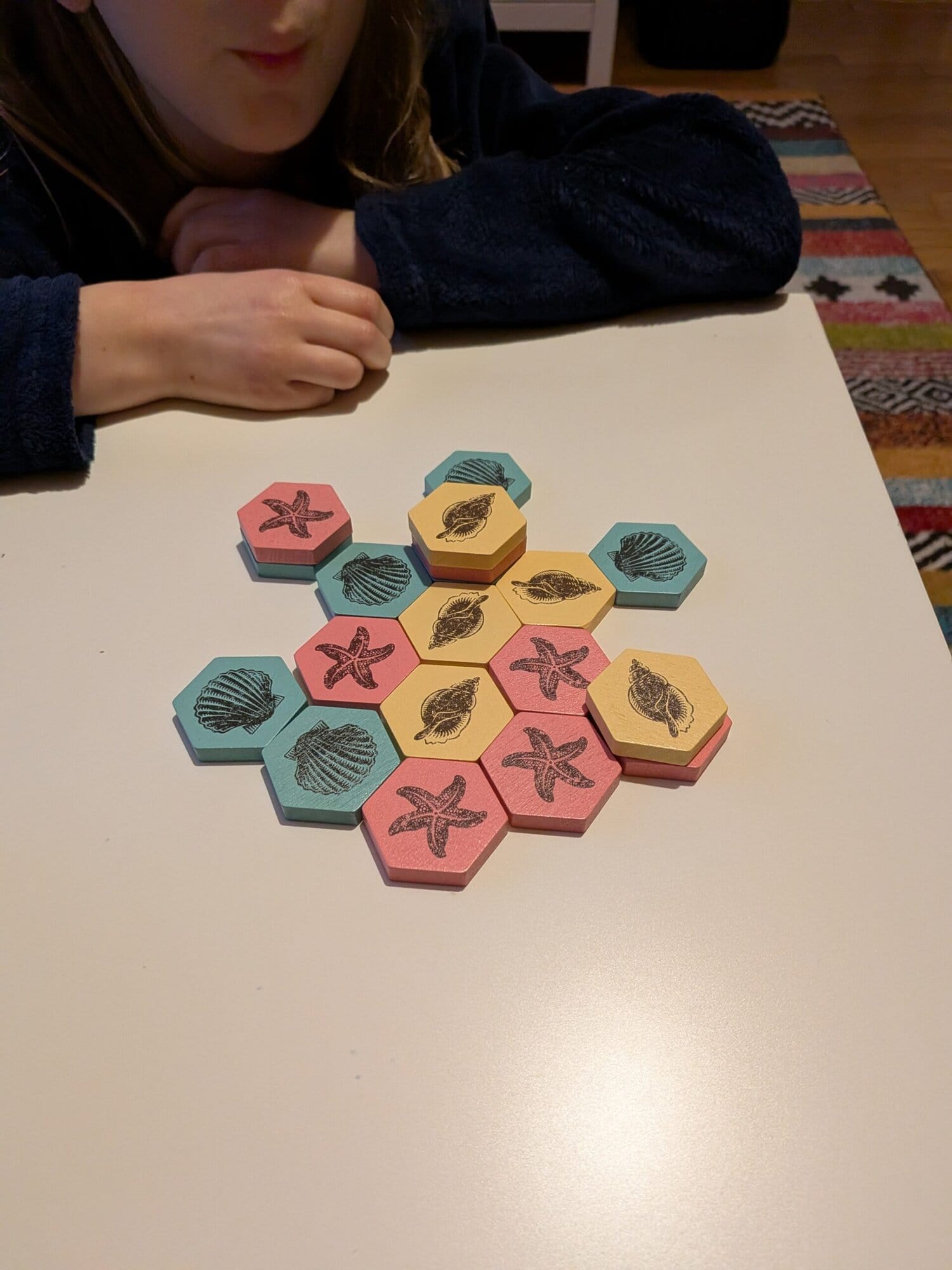 La mise en place est également facile et peut être déléguée à un enfant. Les joueurs créent d’abord un noyau central. Puis ils forment un anneau autour avec les tuiles restantes.