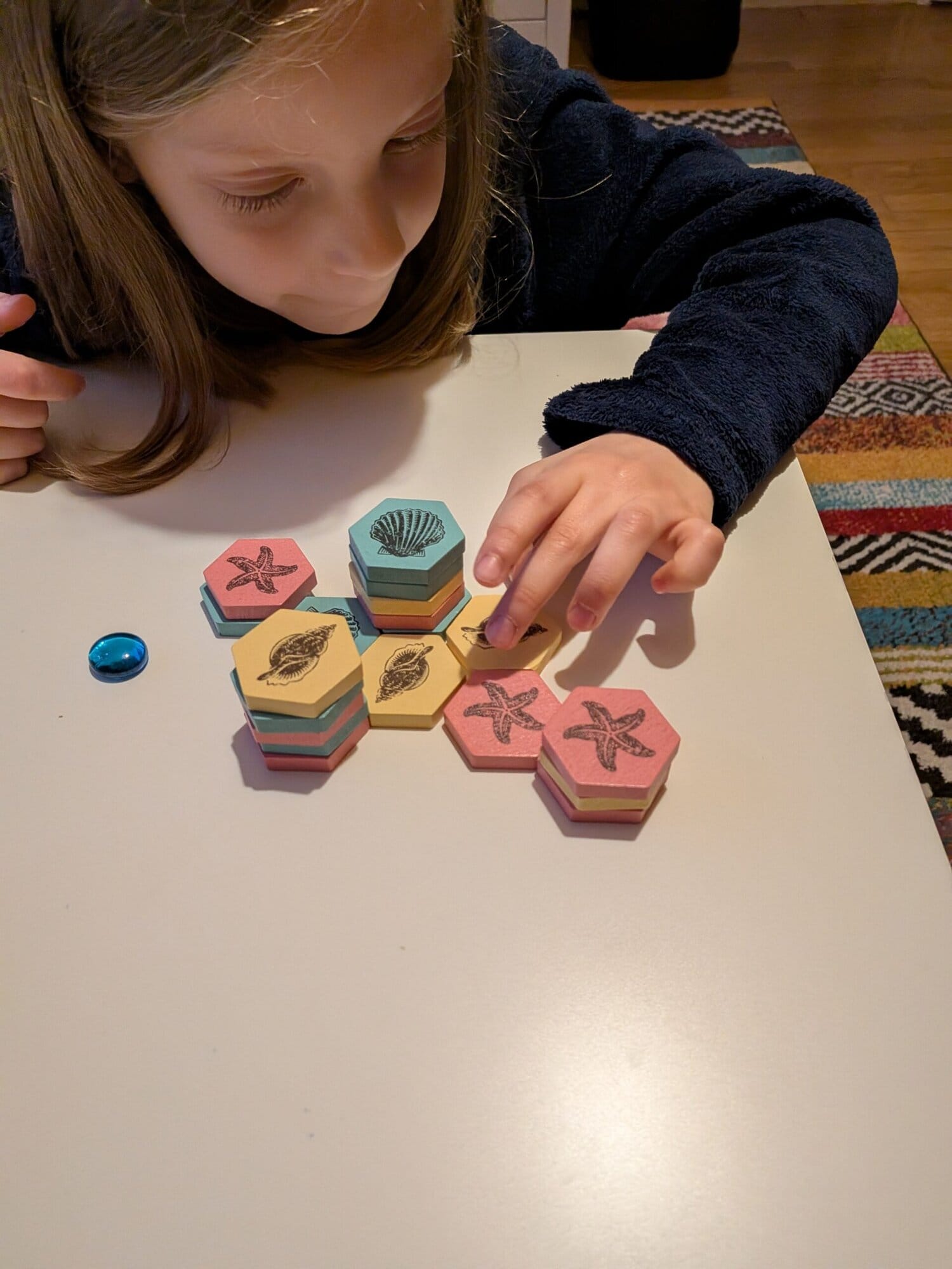 Cependant, le jeu n’est pas parfait. Avec de l’habitude, certaines situations deviennent prévisibles. C’est un classique des jeux abstraits. Ainsi, la rejouabilité repose surtout sur l’adversaire. Il n’y a ni scénarios, ni pouvoirs, ni variantes. Malgré cela, High Tide reste un excellent jeu. Il est idéal pour les amateurs de duels tactiques rapides. Je pense qu’il peut très bien fonctionner en couple. De notre côté nous y avons joué avec mes filles de 6 et 8 ans et elles ont beaucoup aimé affronter leur père ! Surtout quand elles ont gagné bien entendu ;). Enfin le jeu est facile à sortir, ce qui est un avantage vu le rythme effrené des semaines d’école !