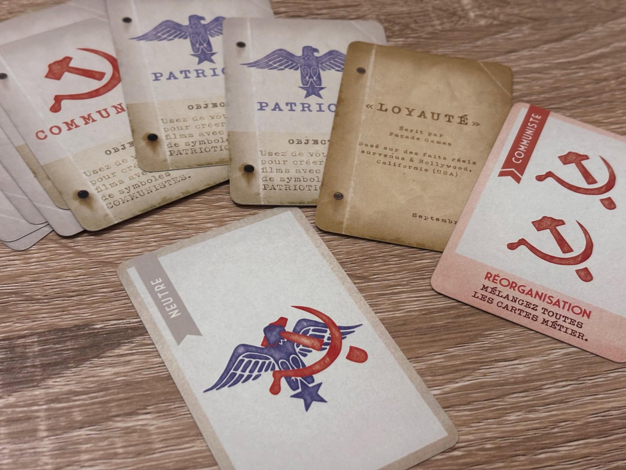 Une fois les manipulations terminées et les derniers regards suspicieux échangés autour de la table, il est temps de passer à l’étape décisive : d’influencer le film. Pour cela, chaque joueur possède en main trois cartes représentant l’orientation idéologique qu’il peut donner au projet : soit un film patriotique, glorifiant les valeurs américaines, soit un film communiste, porteur d’un message bien plus subversif ou neutre si il veut pas se mouiller. Mais bien sûr, personne ne sait vraiment ce que les autres s’apprêtent à jouer. Dans un silence souvent chargé de sous-entendus, chacun choisit alors une carte qu’il pose face cachée devant lui. Est-ce un geste sincère ? Un coup de bluff ? Une tentative de semer la confusion ? Impossible de le savoir pour l’instant.