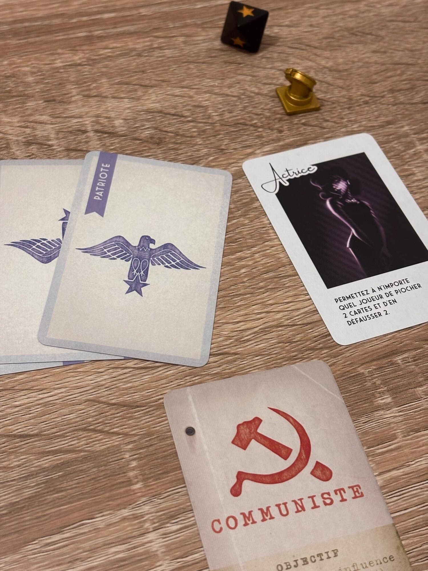 Chaque joueur possède devant lui un dé indiquant s’il pourra ou non influencer le film. C’est une sorte de vote en attribuant des cartes qui peuvent apporter jusqu’à 2 points Patriotes ou Communistes.