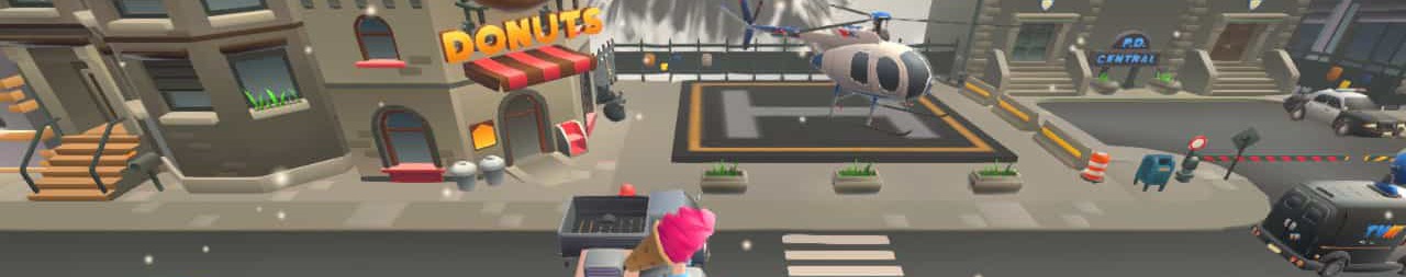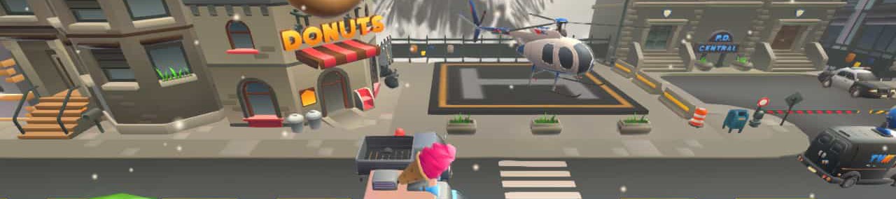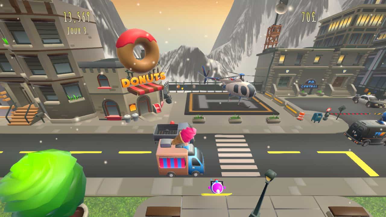 Ou plutôt dans la ville, plus exactement, car la première phase de jeu d’Horatio goes Snowboarding commence dans les rues d’une station de ski. Il y est question d’acheter une planche et surtout d’accéder à l’hélicoptère chargé de vous emmener sur les pistes. Pour se faire, il vous faudra slalomer entre les véhicules sur deux rues d’affilée, typiquement à la manière de Frogger.