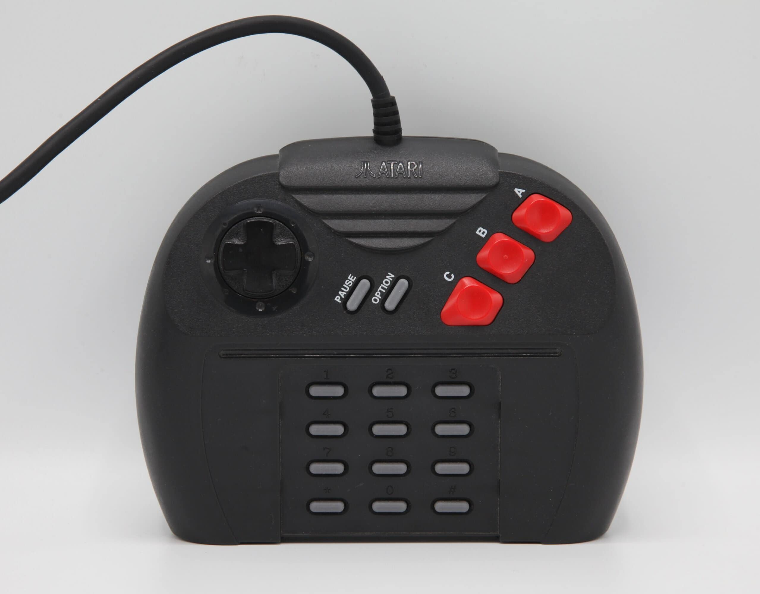Avant la Xbox et sa manette imposante, il y eut la Jaguar. Celle-ci propose un contrôleur particulièrement volumineux, peu maniable, très large et offrant une prise en main médiocre pour quiconque n’a pas de grandes mains. Sa principale originalité réside dans le pavé numérique central, utilisé soit comme raccourci (changement d’armes, gestion de la vie, etc.), soit pour la saisie de codes de sauvegarde ou de cheat codes.