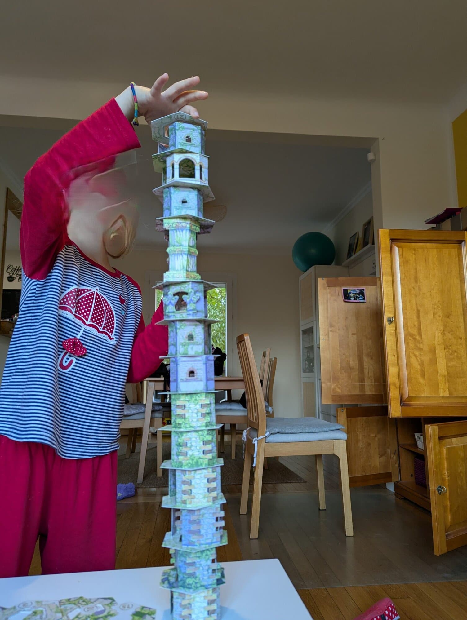 - Le placement des murs et des étages va être délicat : la carte Action va vous imposer deux types de murs et … ils ne font pas la même taille en hauteur ! Vous comprendrez donc que dès votre premier étage, votre tour sera penchée. Inutile de sortir un niveau pour vérifier…