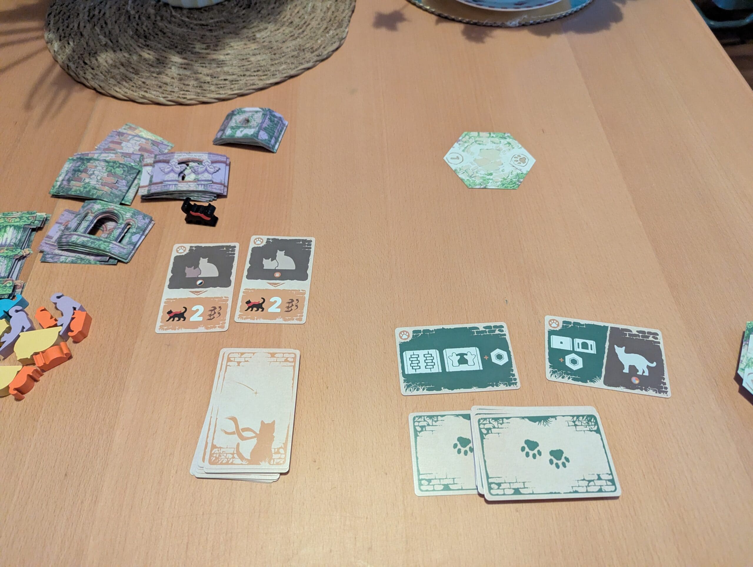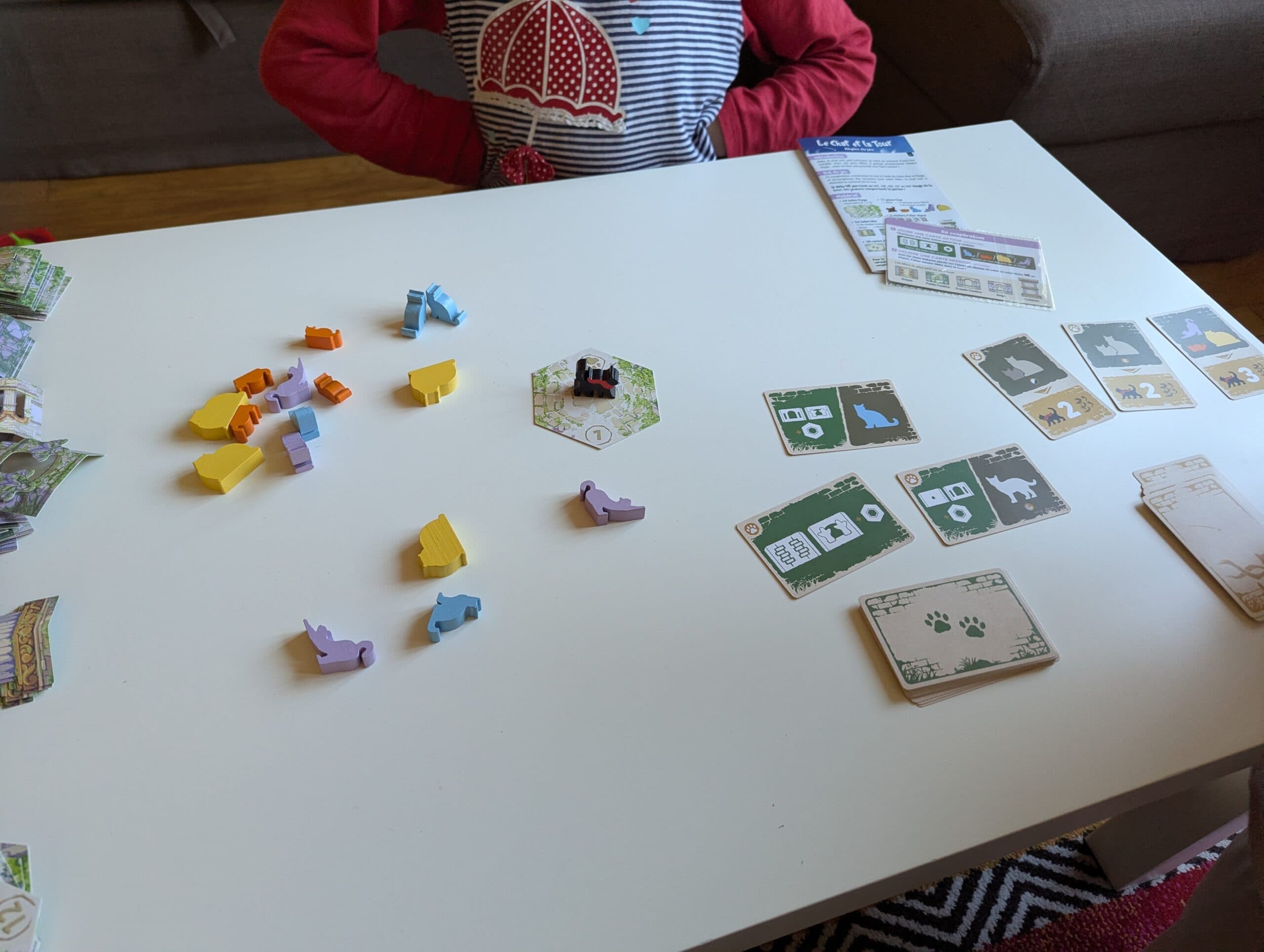 Une fois cette étape nécessitant doigté et finesse réalisée, respirez un grand coup ! Puis il est temps de vérifier les cartes Mission. Si un des objectifs est atteint (par exemple : deux chats d’une même couleur touchent un étage au-dessus de Neko), Neko peut gravir un ou plusieurs étages (s’ils existent…).