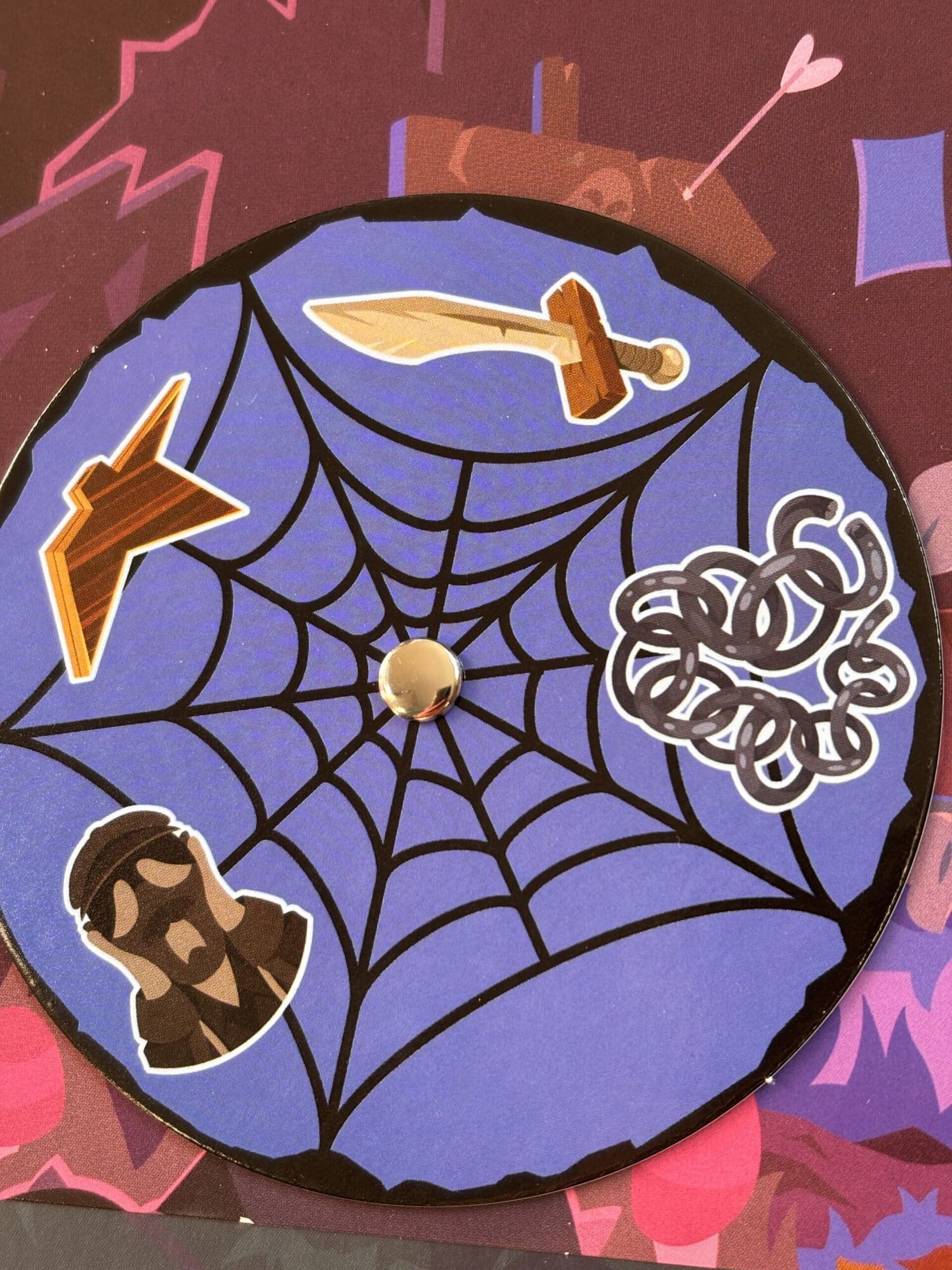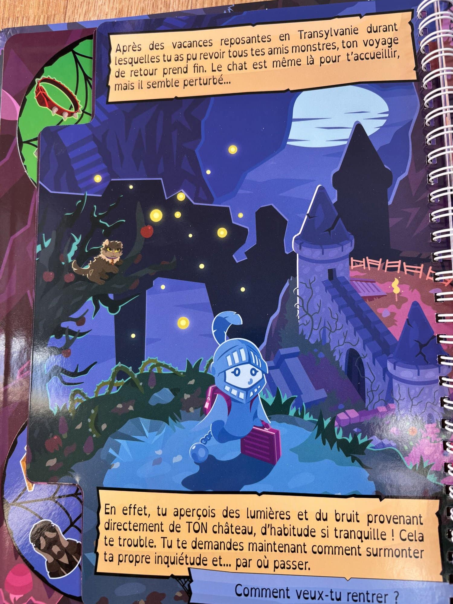 Comme dans les autres livres de la collection, tout repose sur un système de roues d’inventaire intégrées dans la couverture. L’enfant y suit ses objets, ses découvertes et ses transformations. Selon sa forme — fantôme, loup ou chauve-souris — il peut bondir, voler ou traverser les murs. Le concept est très simple à comprendre, même pour les plus jeunes. Et surtout, le livre n’interdit jamais de tenter une action : si l’enfant n’a pas la bonne transformation, il peut quand même essayer. Le texte lui demandera simplement de vérifier son statut sur la roue. C’est une approche bienveillante qui encourage la curiosité sans jamais punir.