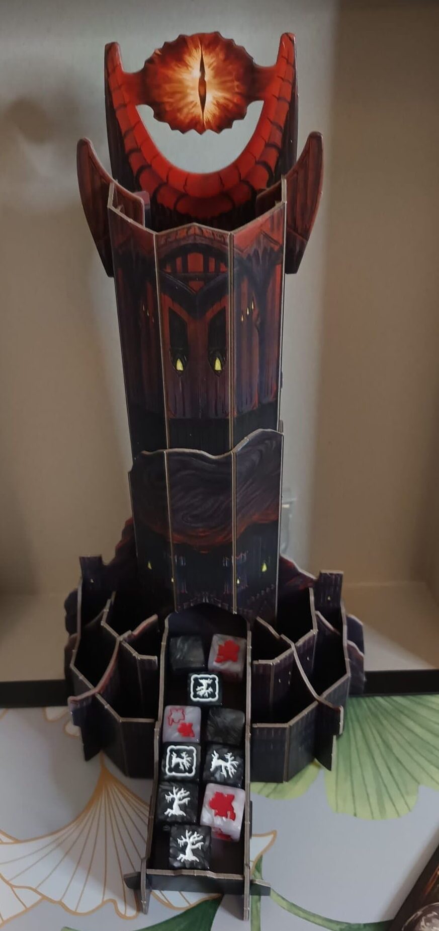 De plus, le matériel est agréable et qualitatif. Il faut monter la Tour de Barad-Dur qui sert ensuite de tour pour les lancers de dés durant la partie. Ce qui est encore plus cool, c’est l’espace de rangement pour la réintégrer sans encombres dans la boite. Il y a d’ailleurs un insert pré-installé pour faciliter le rangement de tout le matériel.