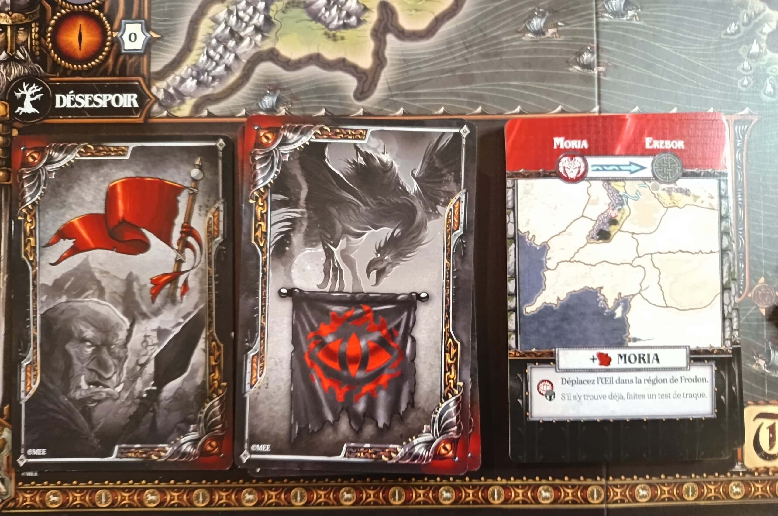 - Piocher 2 cartes Joueur: Cette action permet d’augmenter le nombre de cartes en mains (dans une limite maximum de 7 cartes). Mais parmi ces cartes se cachent les cartes du Seigneur Noir: les cartes « Le Ciel s’assombrit ». Ce sont des cartes qui empêchent la progression de nos personnages et qui augmentent les périls qu’ils vont traverser.