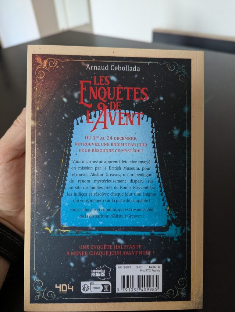 L’auteur Arnaud Cebollada est avant tout un game-designer spécialisé dans les jeux d’énigmes et d’enquête. Il tire son inspiration des Escape Game (il en crée également) afin de créer des jeux vivants et captivants. Il compte plus de dix livres publiés, et une vingtaine de jeux d’enquête produits et des collabs avec Unlock. Avec Les Enquêtes de l’Avent, il applique son expertise du jeu d’énigme pour transformer la simple lecture en aventure interactive. Son insta ici.