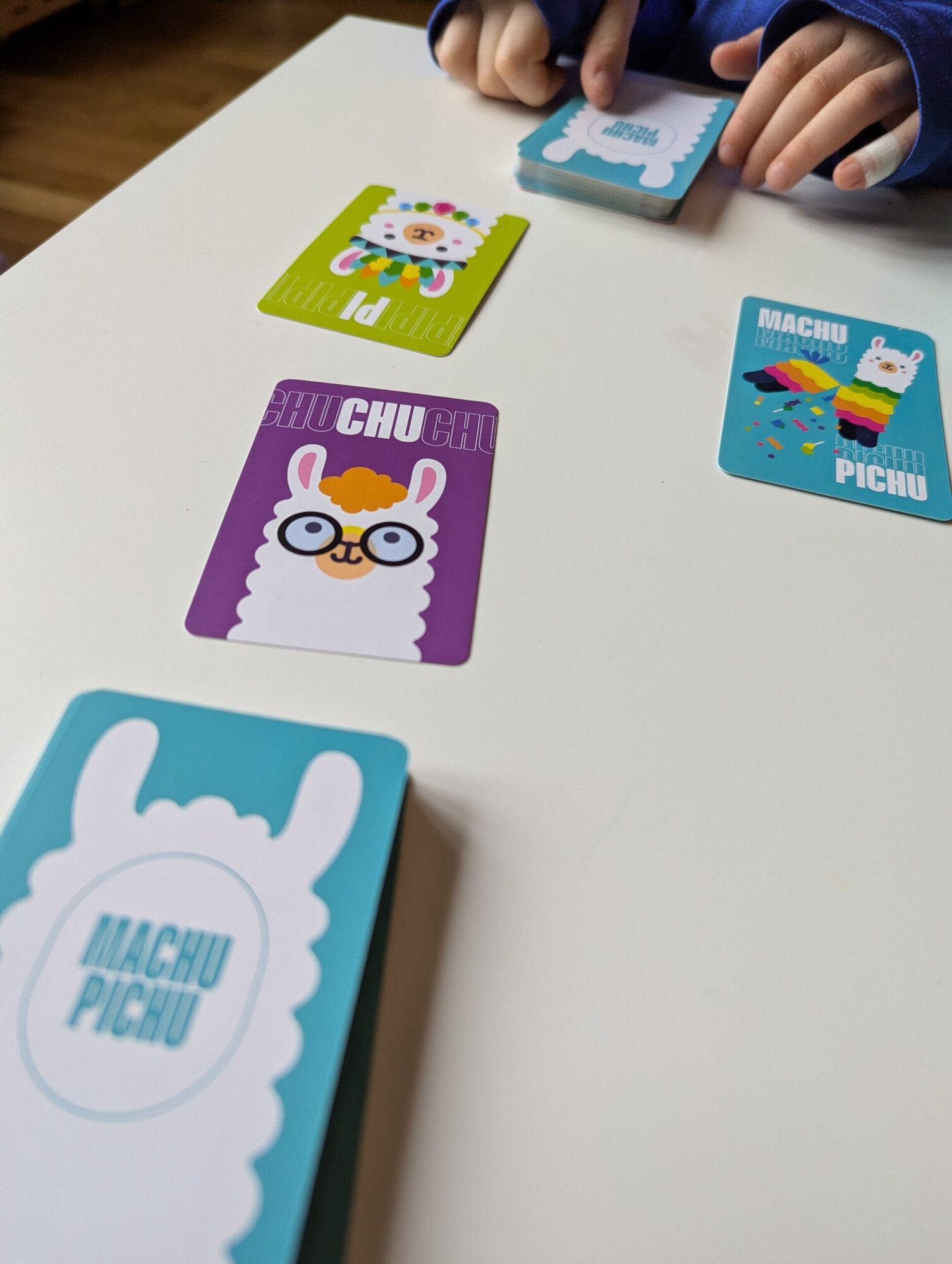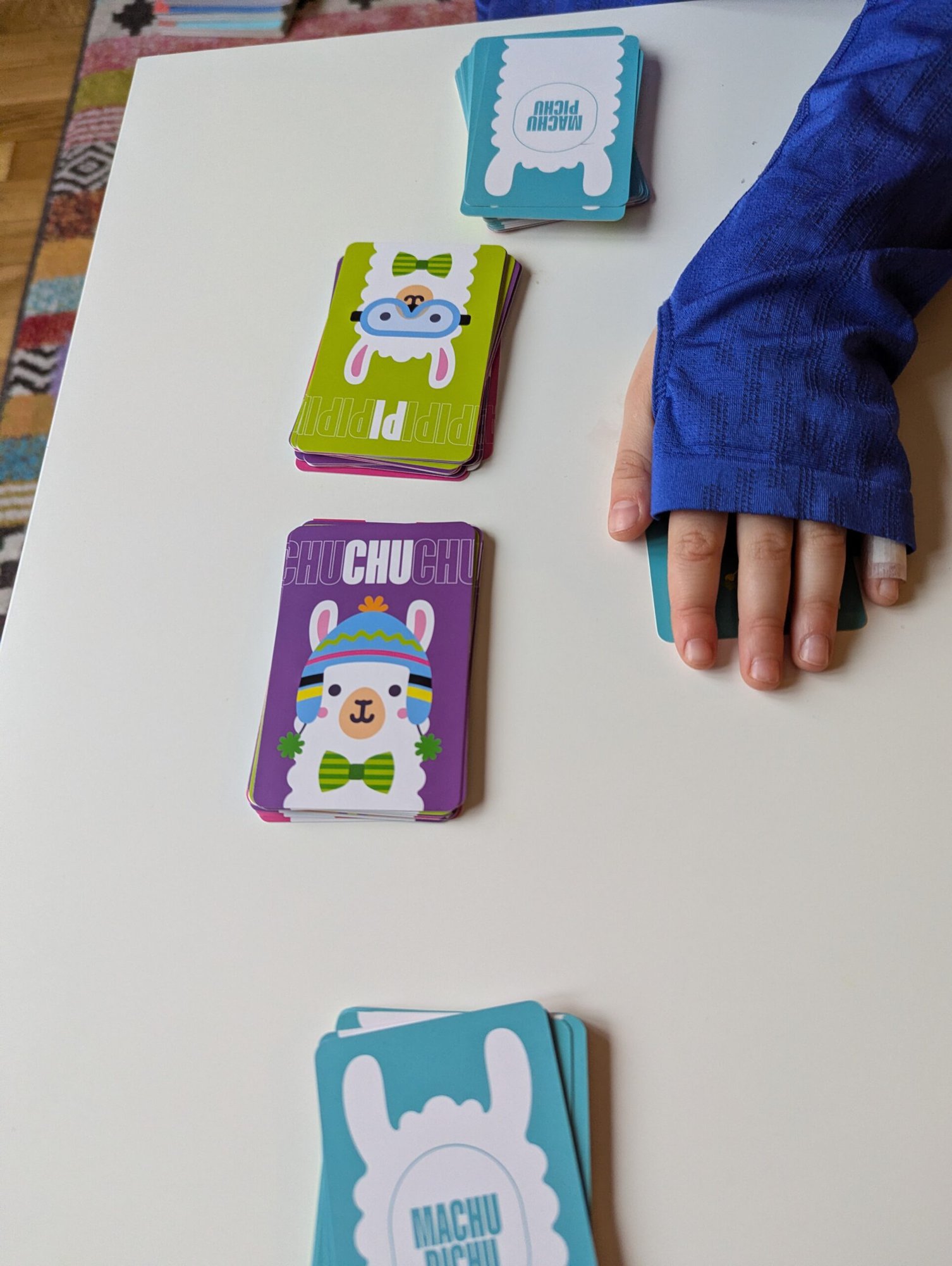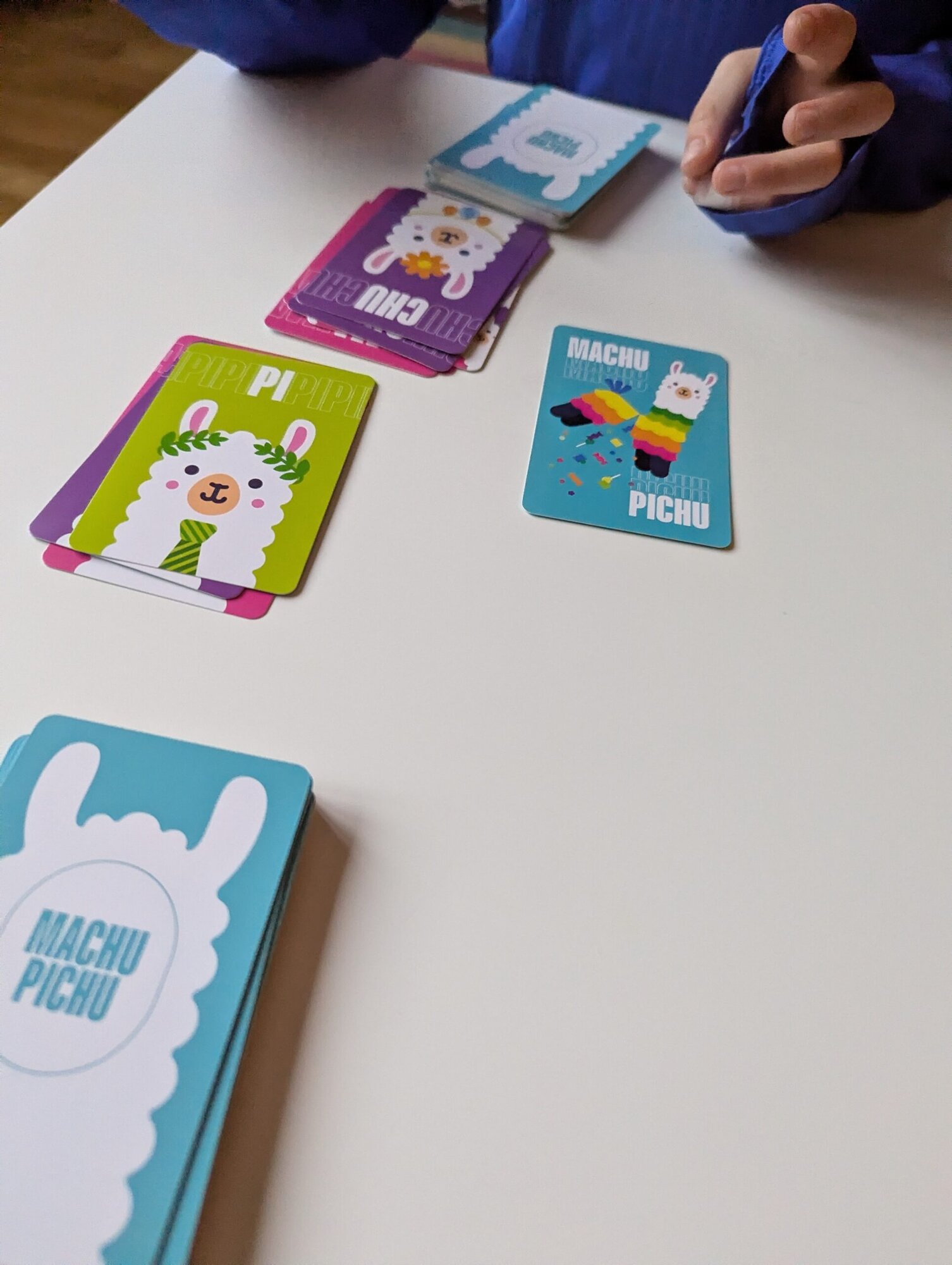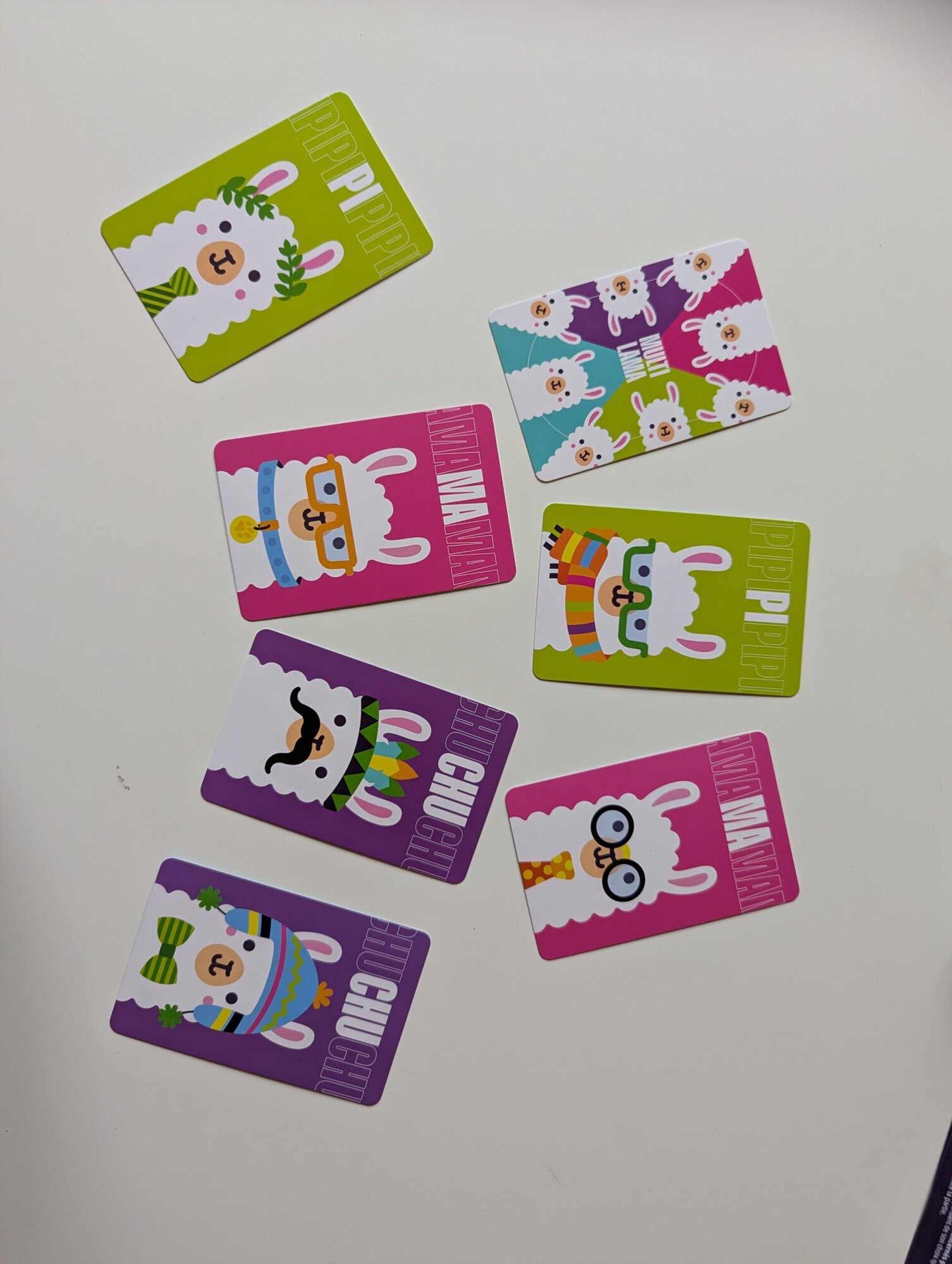 - Chaque joueur a un paquet de cartes. À son tour, il retourne la carte du dessus. Chaque carte montre un lama. Ils ont tous des accessoires différents, et une syllabe (“MA”, “CHU” ou “PI”).