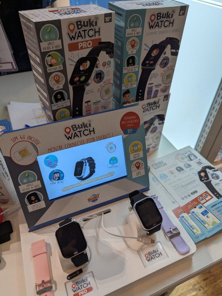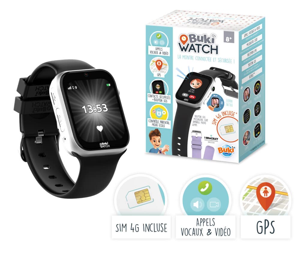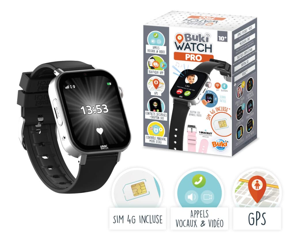 - Enfin, Buki propose également des Montres connectées. Des objets très bien pensés à destination des parents qui cherchent une alternative au premier téléphone des enfants. En général, pourquoi est-ce que les parents passent le pas ? Pour la sécurité de leurs enfants, bien entendu. Pour pouvoir les joindre, et éventuellement les localiser. Pas du tout pour qu’ils passent des heures sur tiktok… Et bien la Buki Watch va répondre à nos besoins de parents ! Elle permet aux enfants de passer des appels vocaux ou vidéo aux contacts et aux plages horaires définis sur l’application parentale. Elle dispose également d’une puce GPS pour alerter en cas de sortie d’une zone de sécurité. Rassurez-vous, cette montre dispose également de fonctionnalités populaires pour les enfants, comme la possibilité de faire des selfies ou de compter ses pas. Le tout fourni clé en main, une carte sim est incluse et peut être activée très simplement avec un abonnement sans engagement à partir de 3,49 €. Pour 79,90 € c’est cadeau, et air-gaming va bientôt la tester pour vous 😉 À noter qu’une version Pro est disponible pour trente euros de plus et vous donnera notamment accès à un magasin d’applications éducatives. Toujours pas de tiktok 😉