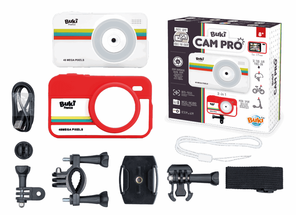 - Appareils photo : Buki France propose des appareils parfaitement adaptés aux enfants. Alors oubliez les appareils photo roses à paillettes qui foisonnent sur Amazon ou Temu, optez pour la qualité française. Les appareils photo de Buki combinent un design fun, robustesse, simplicité d’utilisation, avec certaines fonctions numériques ou filigranes ludiques (filtres de couleurs, effets, etc.). Une belle façon de faire découvrir la photographie, l’image, la créativité visuelle dès le plus jeune âge. Une bonne idée également : ils n’intègrent pas de jeux, ce qui permet aux enfants de se consacrer à la prise de photos ou de vidéos. Le Buki Camjunior, pour enfants à partir de quatre ans, est léger (80 g) et est fourni avec un tour de cou. Avec sa carte SD de 16 Go, sa qualité photo de 40 MP et vidéo de 1080P, et son zoom numérique 8x c’est vraiment un super cadeau que Buki vous fait pour 39,90 €. Vos enfants ont huit ans ou plus ? Passez à la version Buki Campro ! Il a des modes en plus, des specs un plus élevées et surtout il vient avec tout un tas d’accessoires de fixation pour immortaliser les exploits de vos enfants sur leurs vélos ou trottinettes ! Prix : 69.90€