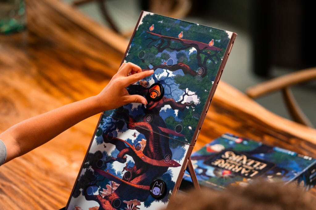 - À présent, un jeu de société qui sort de l’ordinaire avec son plateau 3D qui s’élève tel un arbre centenaire au-dessus de la boîte de jeu : L’arbre aux trois élixirs. Le design tout d’abord est top, et ça c’est important pour donner aux enfants l’envie de jouer. Le plateau qui se dresse est magnétique, enfin… certaines branches de l’arbre le sont en tout cas ! Les joueurs vont devoir le localiser et mémoriser le chemin pour gravir et récupérer l’Elixir des temps… Un jeu qui allie ainsi mémoire, prise de risque et stratégie dans un univers poétique ! A partir de cinq ans, prix 24.99€