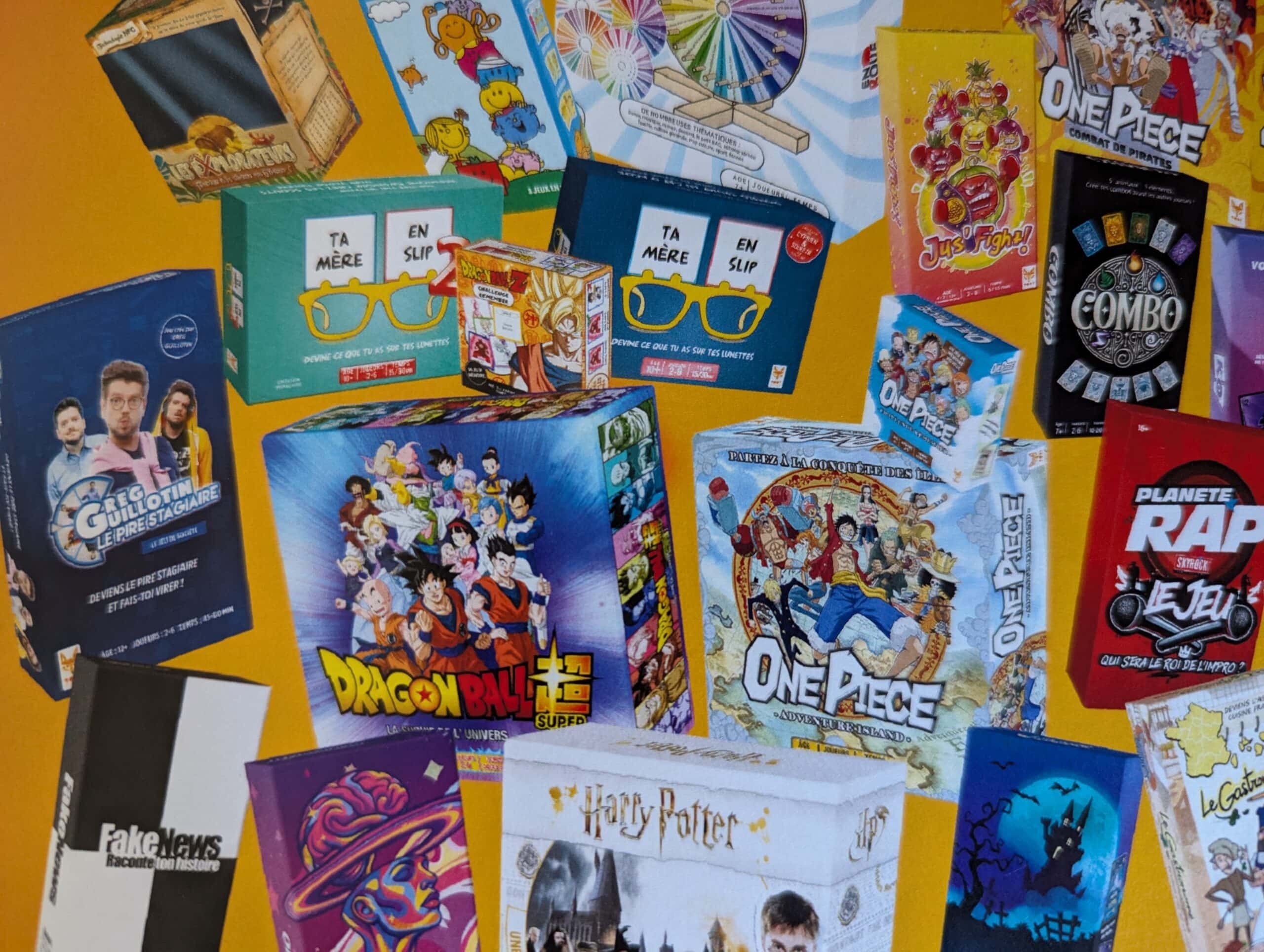 Son catalogue couvre plusieurs univers : des jeux éducatifs, des jeux de famille, des licences très populaires (films, séries, animations, etc.), mais aussi des jeux de cartes rapides ou ambulants pour les moments conviviaux. Parmi les licences phare, citons Harry Potter, mais aussi des références de l’univers Manga telles que Naruto, Dragon Ball ou One Piece. Tout ce qu’il faut pour toucher du 8-12 ans à mon avis, pour les débrancher un peu dans leurs écrans et les introduire au jeu de société dans des univers qui leur sont familiers ! On trouve également au catalogue toute une série de jeux dits de l’univers Youtube, qui regroupent à mon sens du jeu d’ambiance parfois un peu potache. Je vais citer « Le Pire Stagiaire – Le jeu de Greg Guillotin », qui vise à être le premier joueur à se faire virer de stage, ou « En roue libre » qui propose des actions ou vérité adaptés à tous les âges.