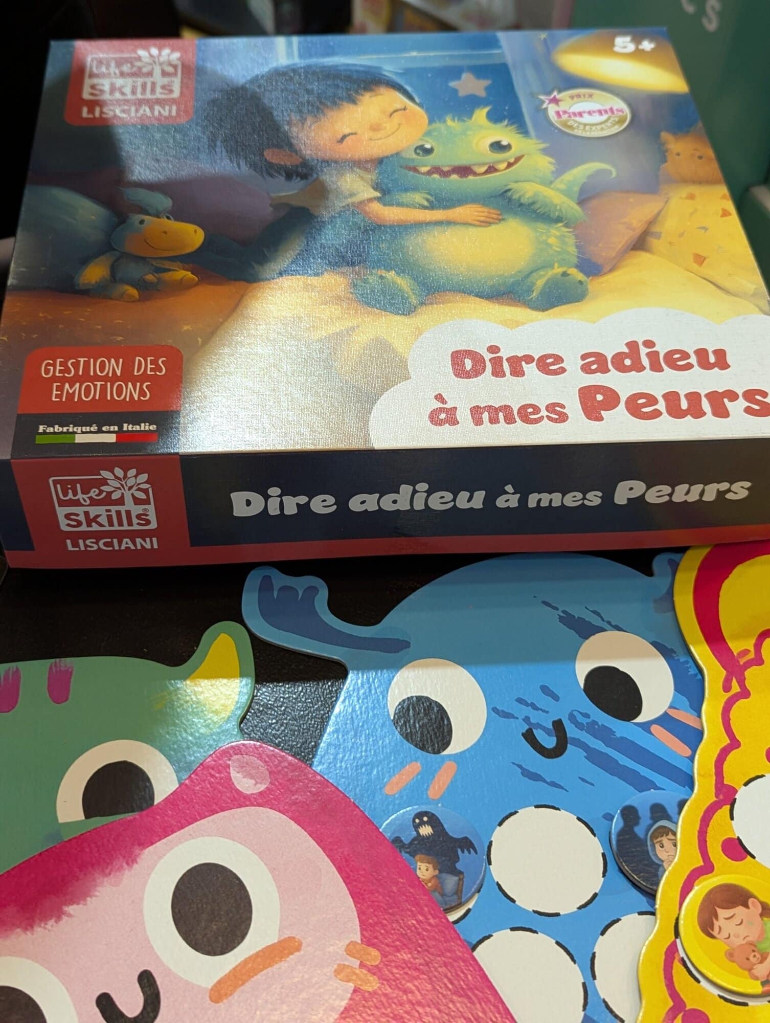 Luscinai nous propose donc pour finir un jeu de société qui va permettre aux enfants d’affronter leurs peurs. Affronter n’est peut-être pas le meilleur terme, il ne s’agit pas d’enfermer votre enfant dans le noir jusqu’à ce qu’il n’aie plus peur de l’obscurité… Le jeu Dire adieu à mes peurs leur permet de communiquer, de verbaliser et de chercher des solutions à leurs craintes d’enfants. Tout cela bien sûr avec l’aide d’un adulte et en mettant en scène des situations concrètes. Ce jeu de plateau se présente comme un jeu « classique » avec ses pions, ses cartes et sa roue mais c’est en réalité un vrai trousseau de clés pour aider les parents à faire grandir leurs enfants. Prix : 19,99€, c’est cadeau !