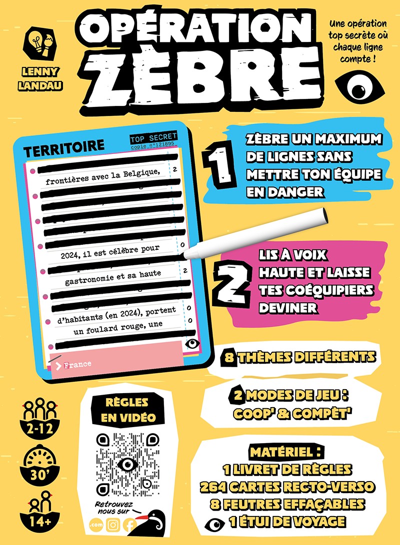 Ma femme avait besoin d’un jeu pour une soirée qu’elle organisait. Le cahier des charges : une trentaine de personnes, moyenne d’âge 50 ans, qui ne connaissaient aucun jeu si ce n’est le Monopoly et Skyjo… Je lui ai donc fait acheter Opération Zèbre et elle a organisé un petit tournoi. Résultat : 1h30 de poilade. Bon ! OK ! On avait simplifié les règles, mais le principal y était.