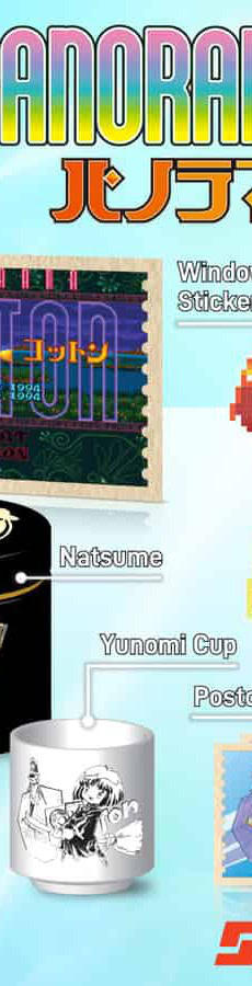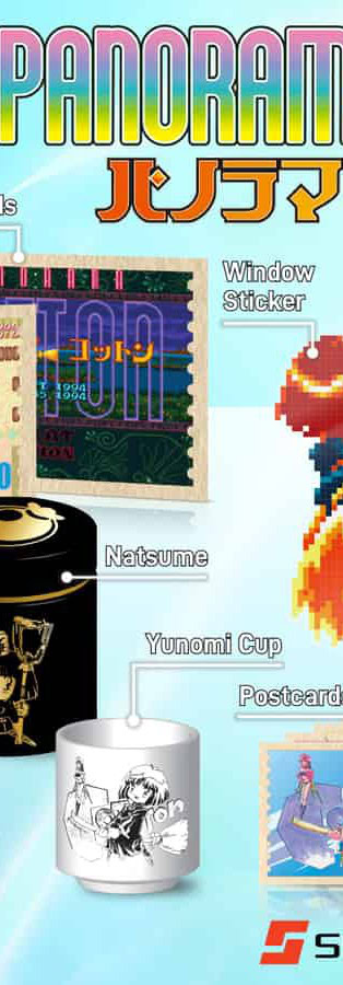 Panorama Cotton édition collector, artbook, cartes, posters et goodies liés au jeu rétro d'arcade sur console Nintendo Switch, avec illustrations et design pixel art.
