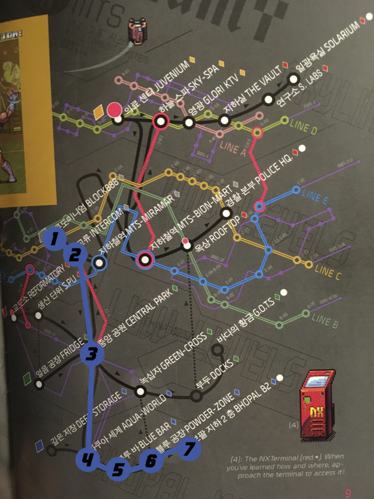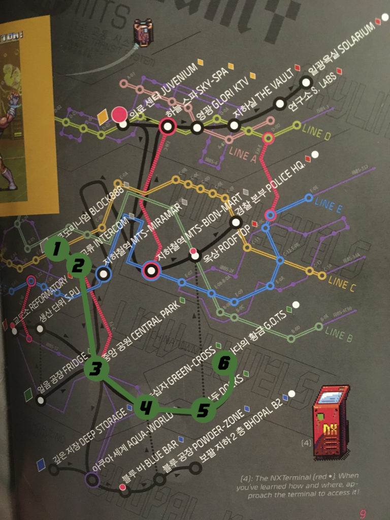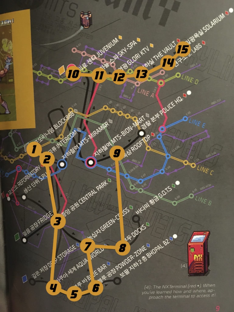 Block 88 > Intercom (puis choisissez Niveaux Bas / Low Levels à l’embranchement) > Central Park (puis choisissez Souterrain / Underground à l’embranchement) > Aqua World > BLU Bar > Powder Zone (puis prenez le passage secret qui mène aux Niveaux Bas / Low Levels) > Green Cross > Docks (puis prenez le passage secret qui mène aux Niveaux Moyens / Mid Levels) > Rooftop (prenez tout de suite le Terminal NX)