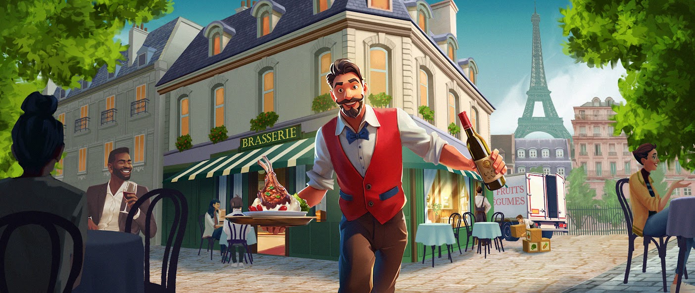 Dans ce simulateur, le joueur se retrouve dans une brasserie parisienne typique. En alternant entre la vue intérieure et la vue de dos, on est dans l’archétype de la brasserie vu par les étrangers, à la manière du film d’animation Ratatouille. Dès les premiers instants, l’ambiance du bistro se fait sentir avec la tour Eiffel en toile de fond : le zinc du bar, le brouhaha des conversations et les nappes à carreaux créent une atmosphère « so frenchy ».
