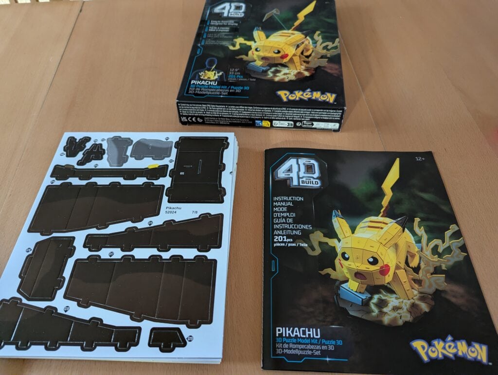 Dès l’ouverture de la boîte, le ton est donné. Le packaging est coloré et clairement orienté Pokémon. À l’intérieur, les pièces sont réparties sur plusieurs planches numérotées. Chaque élément est prédécoupé. Il va falloir dépuncher ! Petite attention bienvenue, un outil est disponible pour enlever les tout petits morceaux de carton dans lesquels les pièces se clipsent.